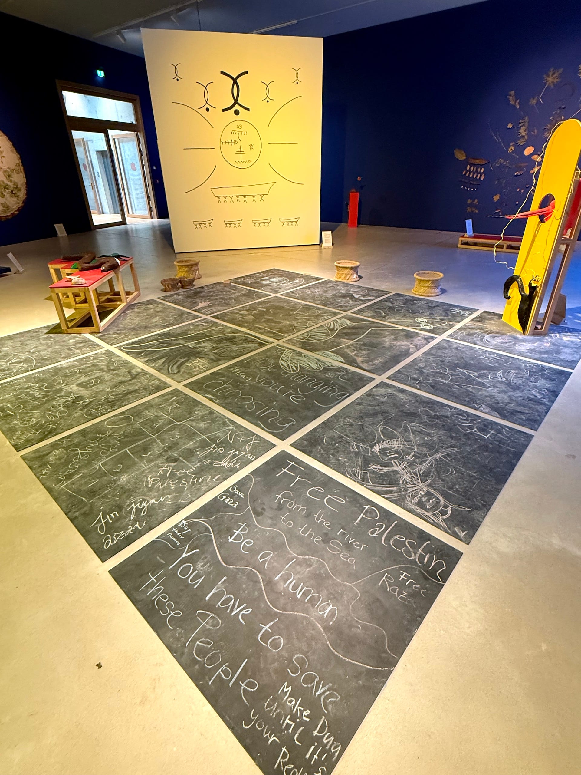 Afro-Indigenous cosmologies, ancestral plant knowledge, and participatory aesthetics intertwine at the center of the gallery, where a wall drawing overlooks a chalkboard floor on which visitors can write notes. Isambert Duriveau’s drawing “Fidji Pawol” (2025) depicts the values of Lasotè, a collective farming method that promotes solidarity, audacity, family, humility, and love. Inspired by the Caribbean tradition of cultivating the land as a communal gesture of reverence, visitors are encouraged to write and draw their own reflections on the floor. A wall text asks: “Who are the guardians in your own ecosystem? Who tends, protects, listens, or heals where you live?” Numerous guests contributed affirming messages about the people of Gaza and their fight to steward their homeland, echoing Spore’s other current exhibition, Unsettled Earth, which deals with Palestinian ecologies of resilience.