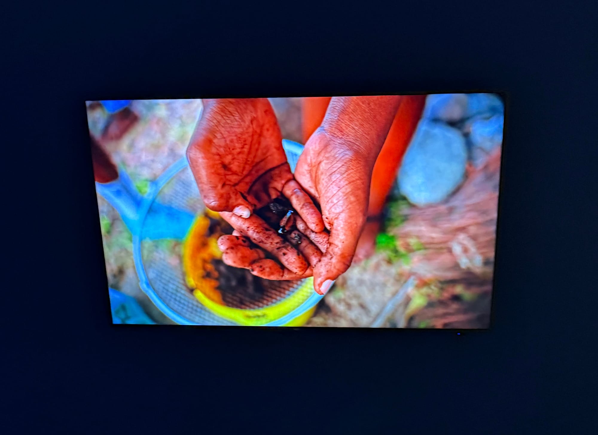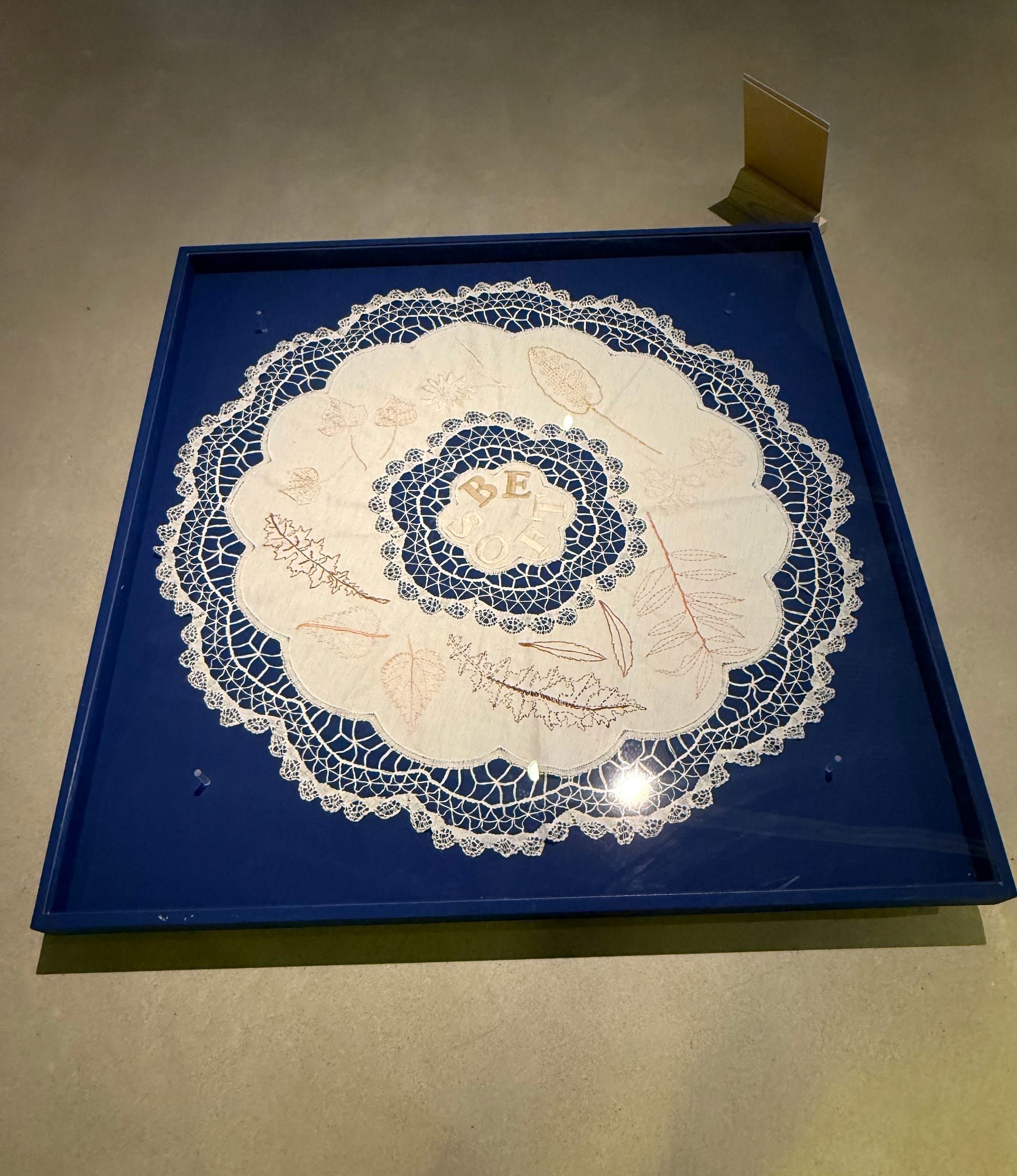 A textile work by Annalee Davis sits on the ground toward the end of the exhibition. Embroidered with plant motifs, “Be Soft” (2023–24) is a woven meditation on tenderness. The exhibition encourages thinking and imagining at the register of “lower frequencies” — poetics and lifeways that are grounded, tranquil, and soothing as an act of quiet resilience in the face of extractive economies that exhaust both land and people. Fittingly, many of the wall texts are low to the ground, encouraging visitors to squat down, as if tending a garden. Doing so is an embodied reminder of the rigor and balance required of such labor.