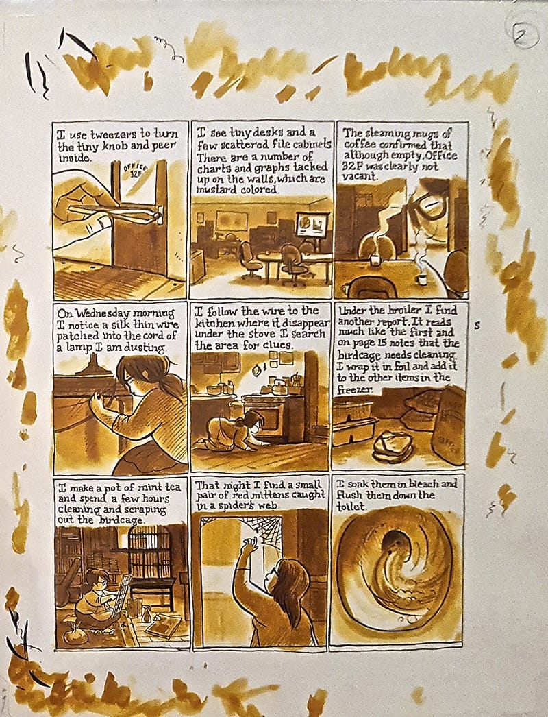 “When you’re doing autobiography, you realize our lives are very repetitive, so a sense of magical realism starts to seep in there,” said Park, who cited British-American cartoonist Gabrielle Bell as an admired peer working in a similar vein. For example, in the story “Office32F,” Park’s comic stand-in discovers a miniature and mysterious office in the walls and baseboards of her apartment, apparently devoted to the task of close-monitoring her daily existence. The tale is equal parts cute and unsettling, with the protagonist taking cues from miniature written reports, which criticize her unkempt birdcage, but also lead her to finding a tiny pair of red mittens caught in a spider web and bizarrely soaking them in bleach and flushing them down the toilet. The specificity of Park’s visual and literary descriptions adds a sense of the uncanny to even the most quotidian urban activities, like Strangers on a Train, which captures moments while riding public transportation.