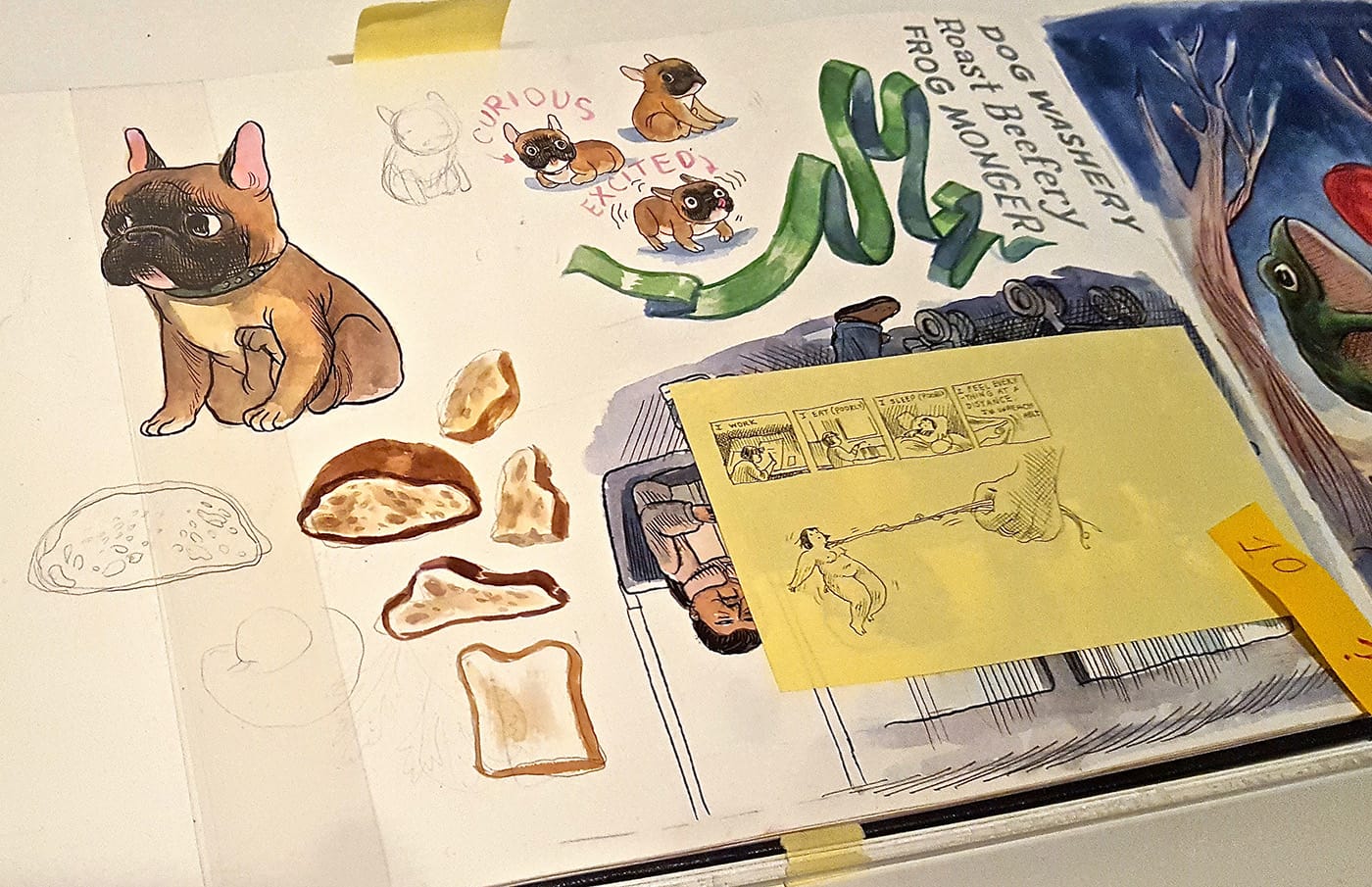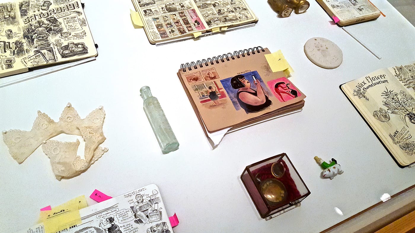 Perhaps the similarities extend farther than Park realizes. It would be easy to characterize her anxiety-riddled and sometimes grotesque cartoon stories — which often star a charming little comic version of herself — as having a dark bent. Park has a personal fascination with medical oddities, lesser-known murderers, and morbid Victoriana; selections from her collection of strange objects are presented alongside her sketchbooks, concept pages, and finished cartoons.
