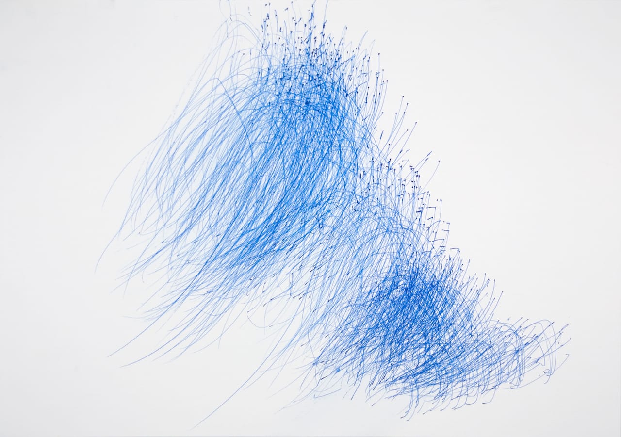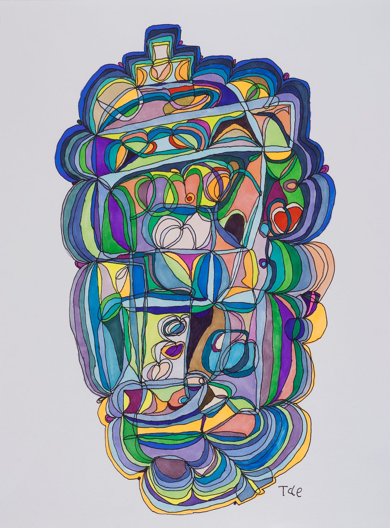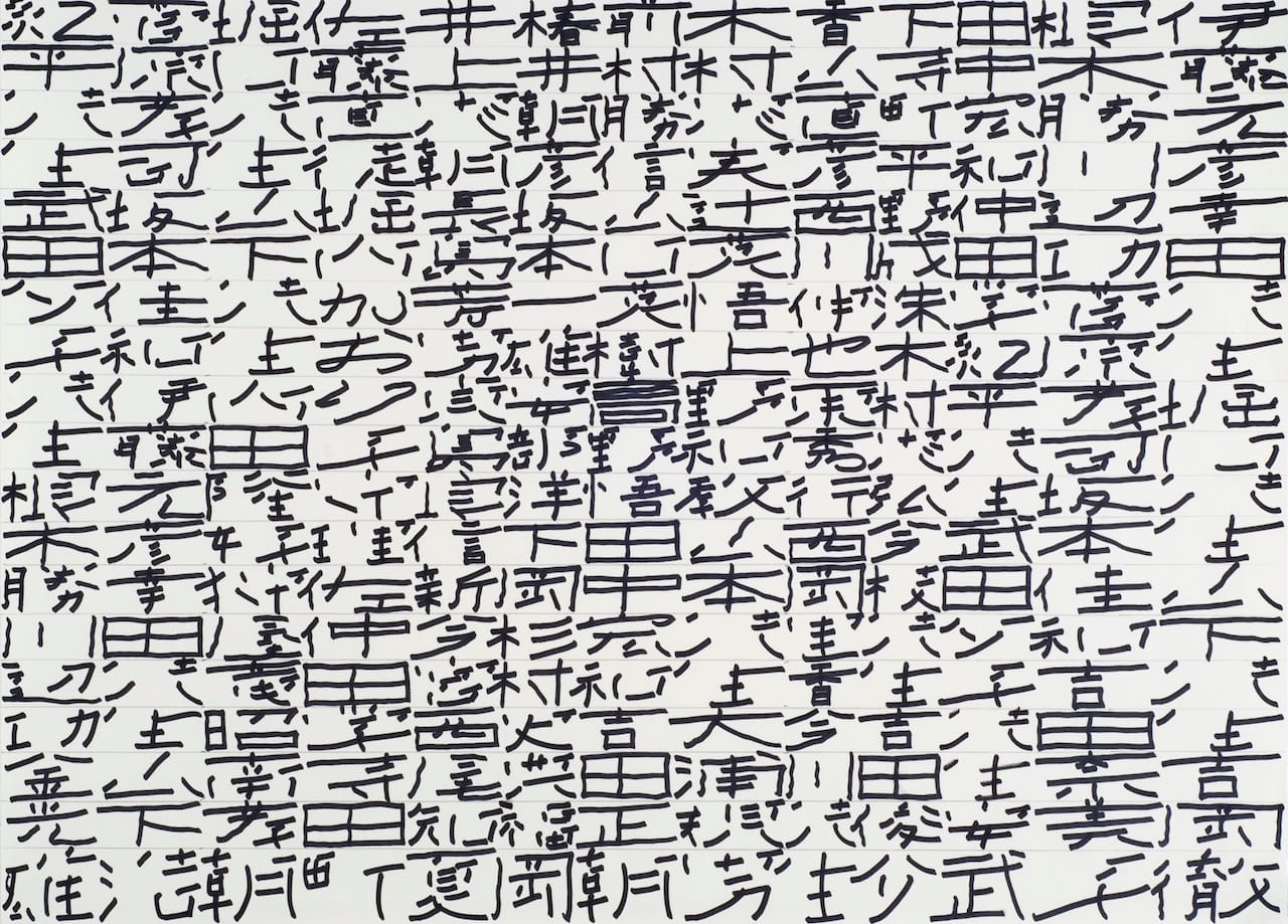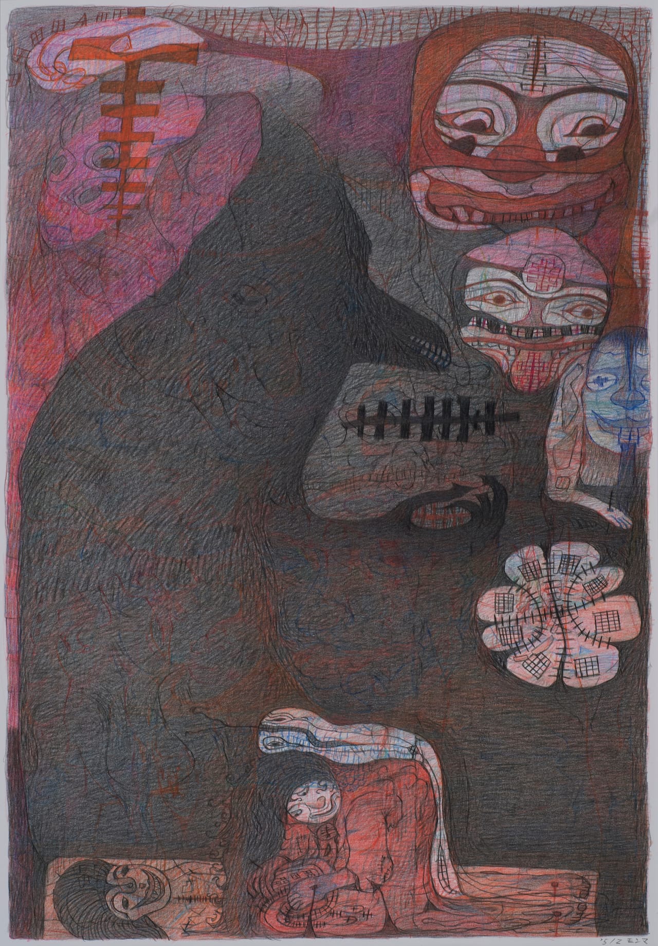 Japan Art Brut features works on paper by ten self-taught artists. Among the mostly abstract drawings on view are Tae Takubo’s marker-pen images of irregularly shaped, brightly colored blobs that seem to pulse with the bubbling, gurgling energy of splitting cells; Akinori Yoshida and Hiroe Kittaka’s ink-on-paper clusters of modified kanji (the borrowed Chinese characters with which Japanese is written); and Yuichi Saito’s wiry clouds of colored-ink lines swirling against white grounds. Also from Japan, the pen, pencil and colored ink drawings of the artist M’onma have been one of Cavin-Morris’s big discoveries of recent years. In this sixty-something draftsman’s dense compositions, filigrees of fine lines create multiple layers of overlapping, random patterns, through which the faces of clowns, phantom-like deities or half-human, half-animal figures appear.
