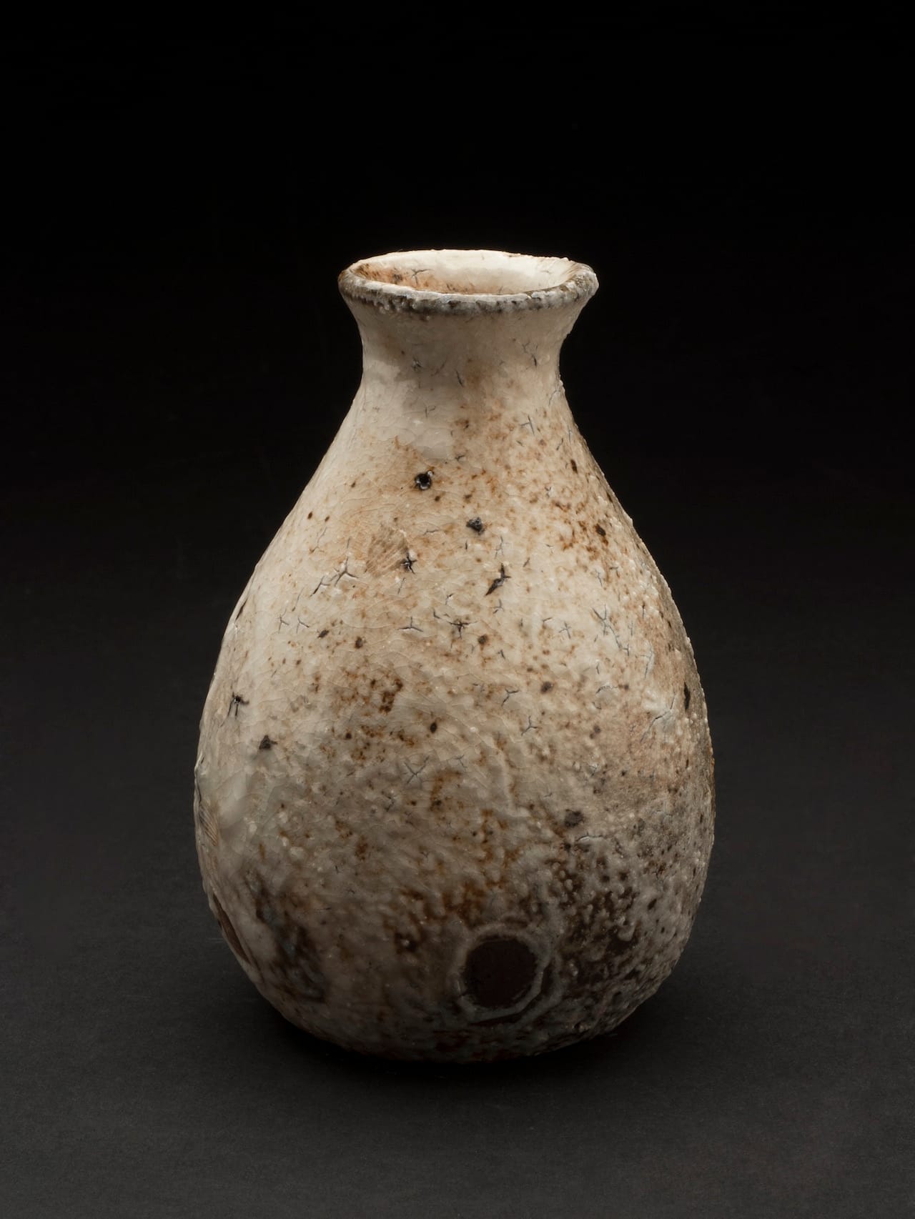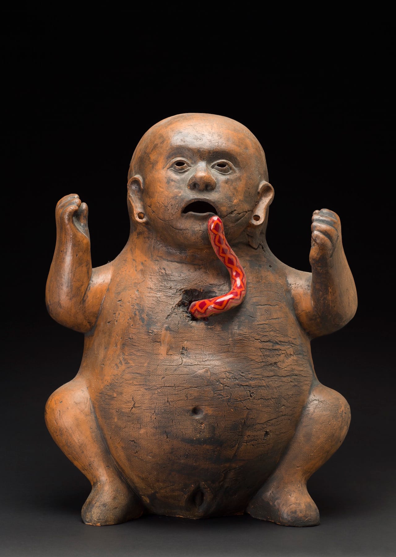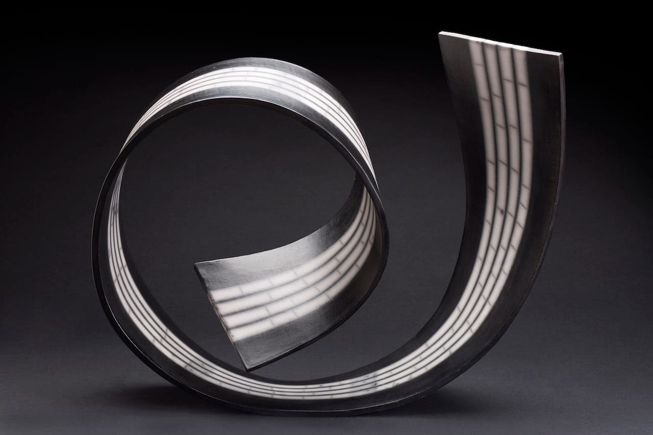 Nearby and in sight of these drawings, set atop plain white pedestals of varying heights, sit such works as Purvey’s “October — Landscape Series” (2013), whose crusty, finger-shaped surface echoes the visual texture of one of Yoshida’s kanji compositions; raku-style cups, bowls and sake bottles by Iburg, Yamada, Nikaido and Curtis; Ferguson’s gutsy stoneware vessels that resemble giant nuts and sometimes incorporate thick, spiky lips; and the Peruvian Velarde’s plump, squatting female figures, which exude the spirit of ancient, pre-Columbian pottery. They do so with a contemporary twist, for they allude to a modern woman’s self-awareness of her body, along with her struggles, aspirations and grief. Installed next to Saito’s wispy drawings, Simcha Even-Chen’s curlicue ribbons of black-and-white, so-called naked raku, look like big licorice strips; their forms reverberate in a call-and-response with the energy of the Japanese draftsman’s abstractions.