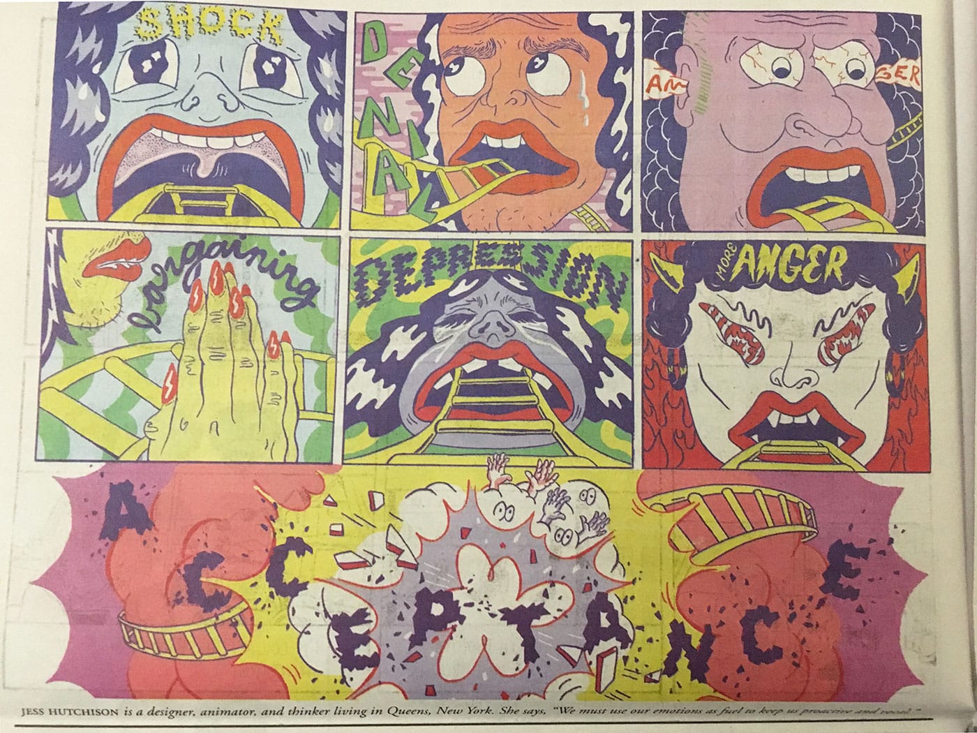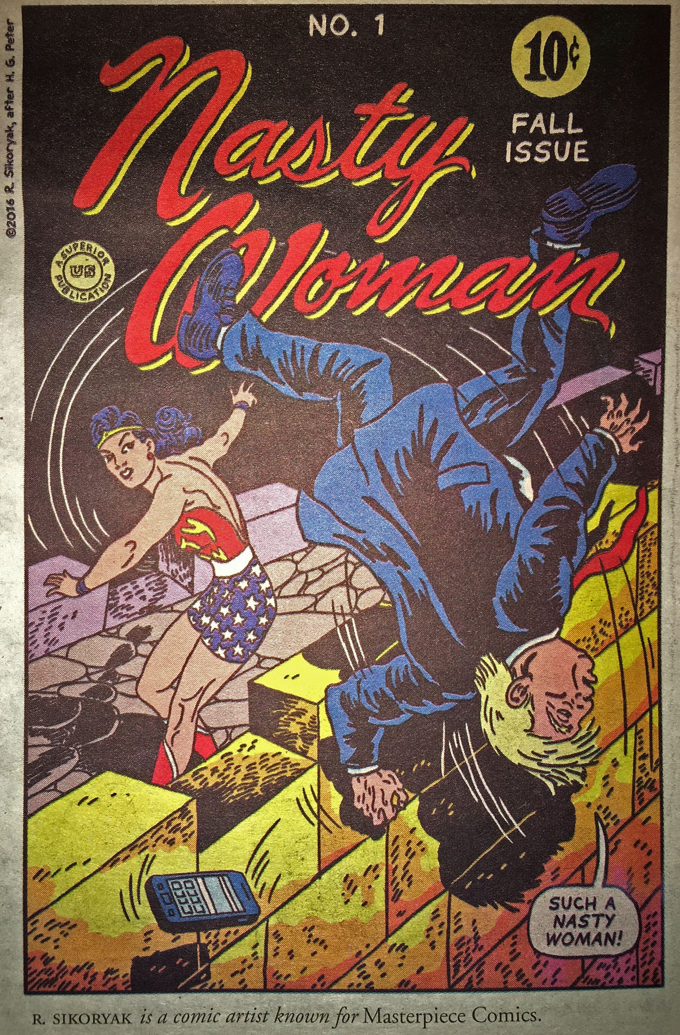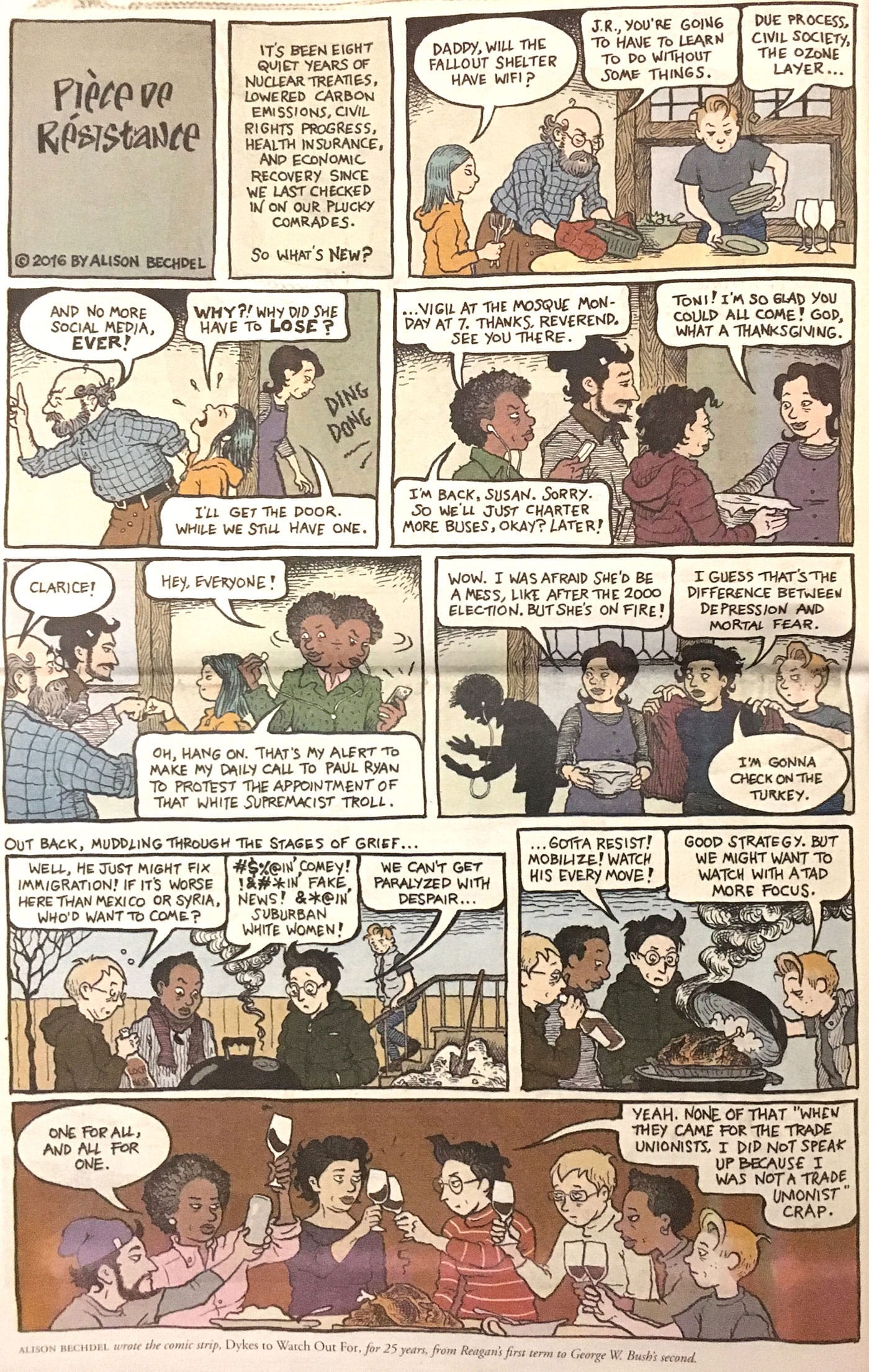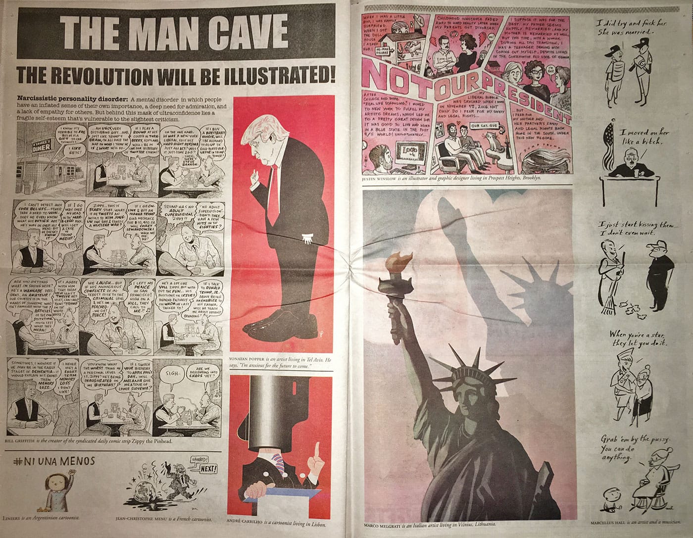 Mouly scrawled the title RESIST! in red sharpie, and Spiegelman put out a call to action and a call for artwork on social media. The pair received over 1,000 submissions — by women and men, young and old, American and international, all expressing a range of emotions regarding with the current President and his proposed cabinet. They narrowed down the submissions to those that could fit in a 40-page newspaper, including the work of lesser-known artists alongside comic legends and New Yorker illustrators such as Alison Bechdel, Roz Chast, Bill Griffith, and Kristen Radtke.