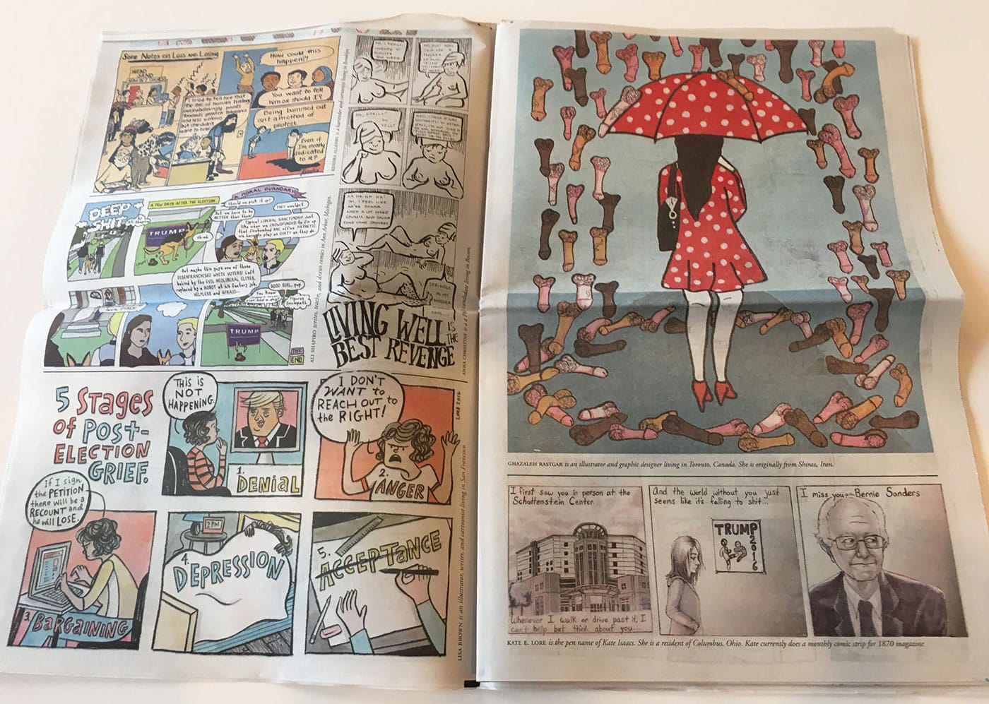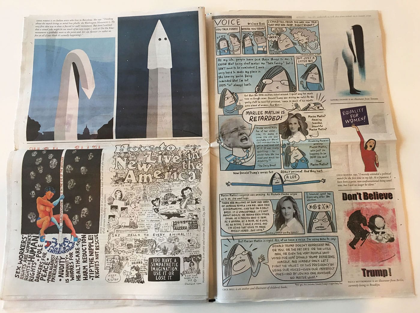 Against the backdrop of the #J20 art strike, free museum programming on January 20, and millions of people joining the Women’s March on Washington and solidarity marches across the world, Gabe Fowler, owner of the Williamsburg, Brooklyn, comics shop Desert Island, decided to devote a special issue of his comics newspaper, Smoke Signal, to women’s voices. Watching the election results tally up in the early hours of November 9, Fowler decided he had to take immediate action. “Gender issues were in front of this whole election,” he told me. Doing an issue of Smoke Signal that focused on women’s voices seemed the best way to respond. “But I am still a man doing an issue on women’s voices — how do I get myself out of the way? Then I thought of having a guest editor for the first time. And if I could have anyone, the dream would be Françoise.” With a little prodding but very little convincing, Françoise Mouly, art editor of The New Yorker, agreed to compile and edit the collection, with the help of her daughter, author Nadja Spiegelman. As Mouly explains in the forward to the paper, “The proposal felt right, a call to action, irresistible.”