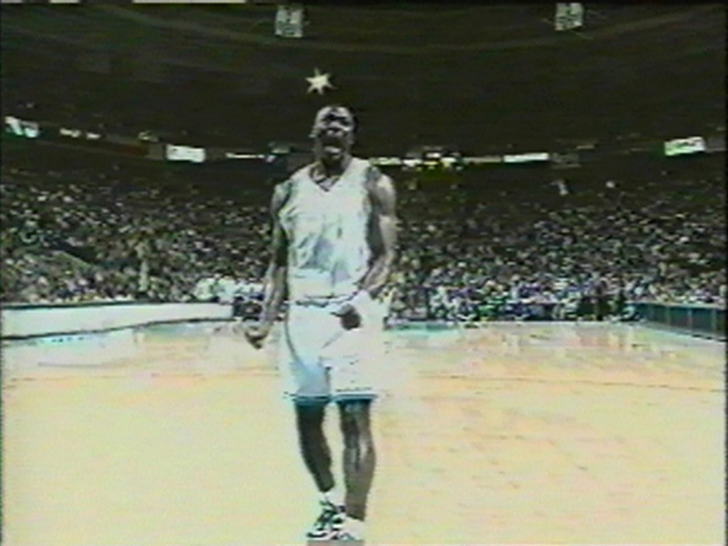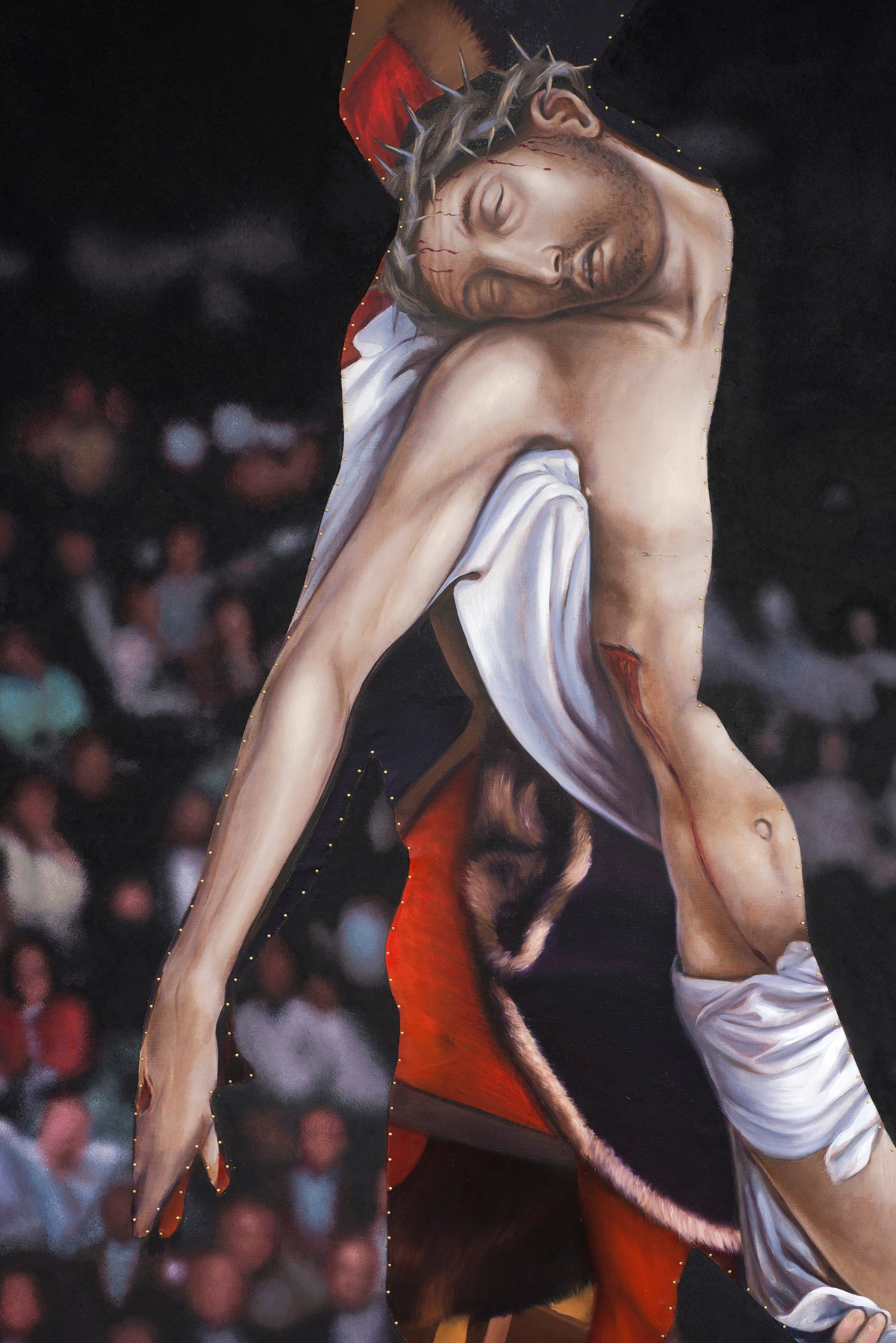 The exhibition is small, tucked away behind central staircases leading to the Virgil Abloh show upstairs and a theater below. Perhaps due to its size (9 x 7’), Titus Kaphar’s 2016 painting, Ascension, is presented on the exhibition space’s outer wall. The hollowed silhouette of a basketball player mid-dunk is filled with a reimagining of Rogier van der Weyden’s The Descent from the Cross, one of the most well-recognized visual depictions of the crucifixion in (art) history. Placed on the opposite side of the wall from the exhibition’s namesake, Paul Pfeiffer’s 1999 video work Fragments of Crucifixion (After Francis Bacon), also features an image of a professional basketball player, crying out after, I assume, making a slam dunk. These two seconds are set on a silent endless loop, infinitely rewinding a moment of joyful outcry, scaled to only 3 inches wide via a tiny projection. Pfieifer, in an interview with curator Chanon Kenji Praepipatmongkol, notes the varied meaning: “the scream continues infinitely, so it becomes ambiguous as to whether it’s a scream of pleasure or a scream of pain.” In its endless loop and affective outburst, Pfeiffer’s work also points to the repetitive nature of religious and spiritual acts. Together, the two works explicitly highlight the grim irony of the Black body being both a profitable commodity in the realm of professional sports, and one of the most targeted by law enforcement and society — both dynamics of which leave the body in ruins. Images of Colin Kaepernick’s 2016 kneel come to mind, along with the financial and professional repercussions that followed.