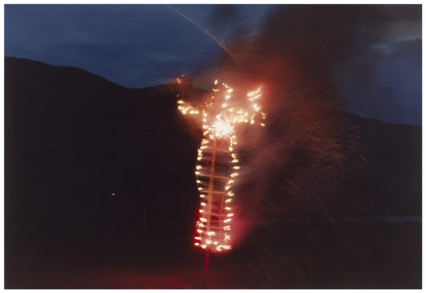 In making this series, Mendieta drew inspiration from Indigenous goddess figures, and spiritual practices of both her native Cuba (specifically, Santería, or Regla de Ocha, which originated there) and those of Mexico where she made the majority of these works. In their original intent, these images of bodily traces are not references to the crucifixion, but put within this context, the shadows inevitably beg associations. Their inclusion here highlights the hybrid nature of Santeria and other religions prevalent throughout the Americas due to Spanish colonialism. This hybridity highlights the range of just who and what Christ’s crucifixion represents, and further, who may use these images.