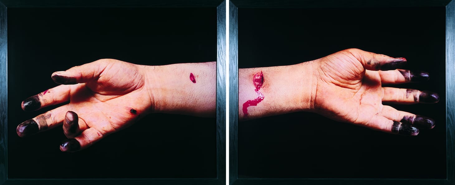 Explicit acts of violence, like those Mendieta alludes to, are also reflected across the way in Andres Serrano’s Untitled (Knifed to Death I and II), a massive diptych in which each photograph depicts the punctured forearms and hands of a stabbing victim lying in a temporary resting place; the artist was granted access to a morgue to photograph victims of violence on the condition that he keep their identities anonymous. The wounds, indentions on the wrists caked with dried blood, recall the wounds Jesus displayed to Doubting Thomas.