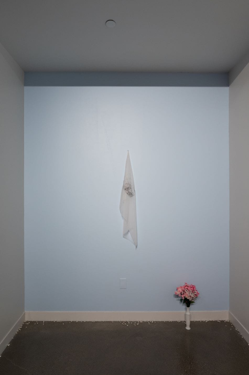 Using this argument as a pillar, Dr. Ortega invited the artists to focus on the devotion, resilience, and belonging that are elemental to the pieces in the collection. Most of the artists looked to their past — their culture, their family, their struggles — as they created. Juan Molina Hernández’s embroidered portrait of their great-grandmother, using hair as thread, invokes the quasi-religious idea of motherhood in Mexican culture while playing with the notions of gender in relation to hair. A plastic flower bouquet on the floor alongside pearls creates a contemporary corner of reverence to the feminine ancestors.