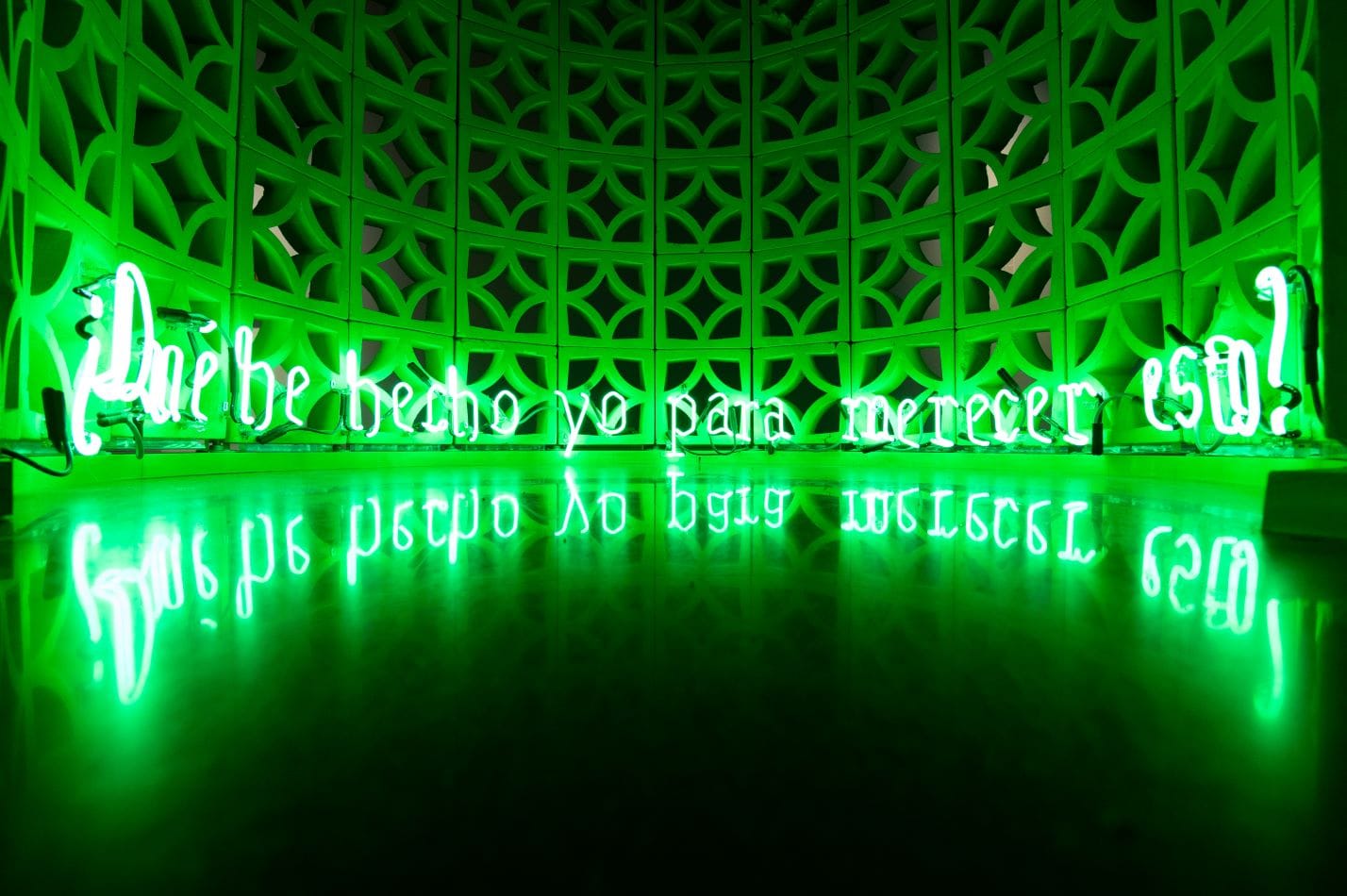 Krystal Ramirez’s chapel built with hand-made gypsum and cement with a neon sign that reads “¿Qué he hecho yo para merecer ésto?” (What have I done to deserve this?) combines the blue-collar construction work background of her immigrant father with the title of director Pedro Almodovar’s 1984 movie, which dealt with the hardships of housework. The piece proposes a dialogue about gender roles in the Mexican machista culture, contrasting pop imagery from mainstream artistic movements with traditional family values.