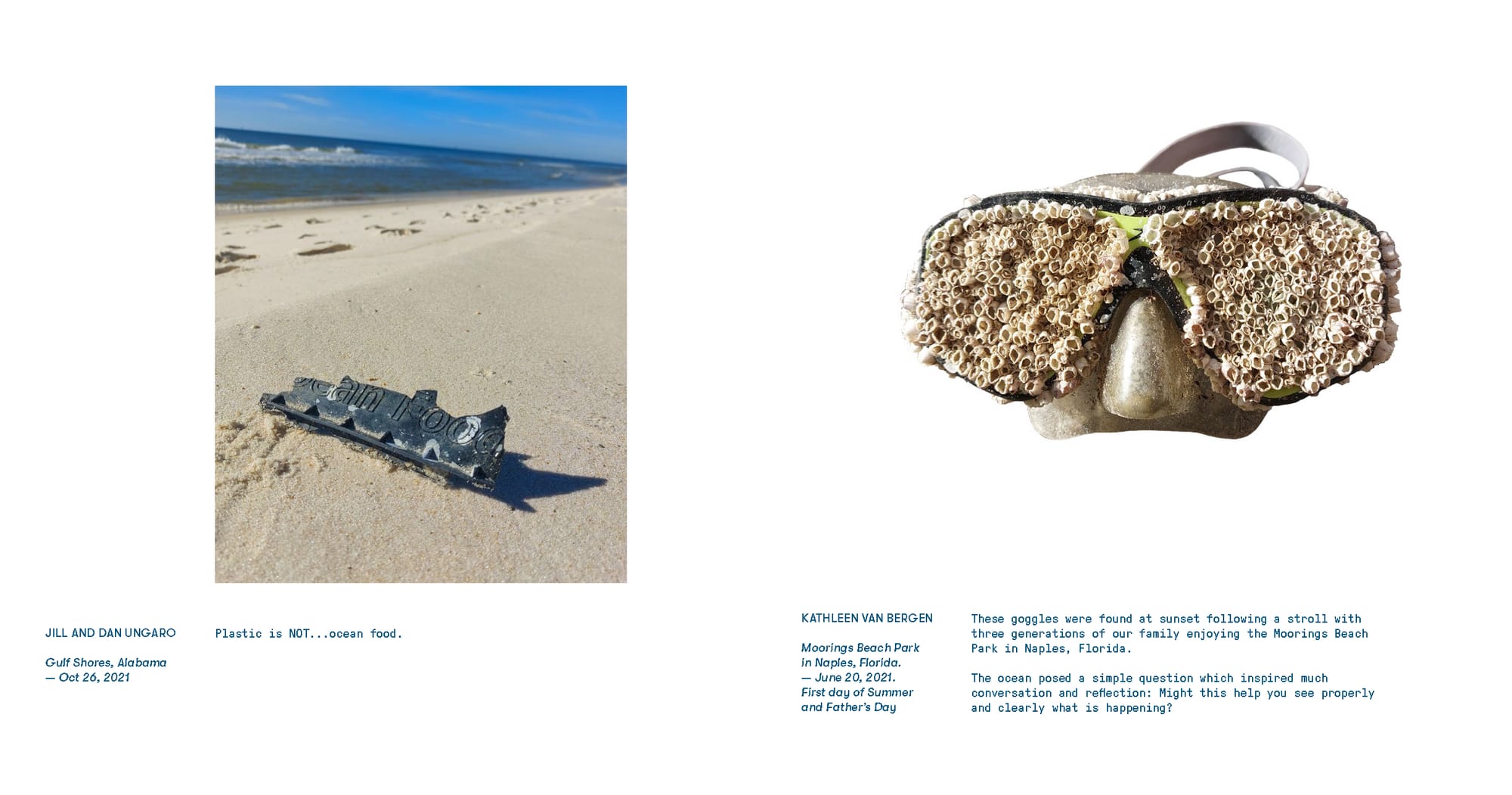 Kathleen Van Bergen, another contributor, describes a scuba face mask she found at Moorings Beach Park in Naples, Florida on June 20, 2021, bristling on every internal and external surface with barnacles: "The ocean posed a simple question which inspired much conversation and reflection: Might this help you see properly and clearly what is happening?"