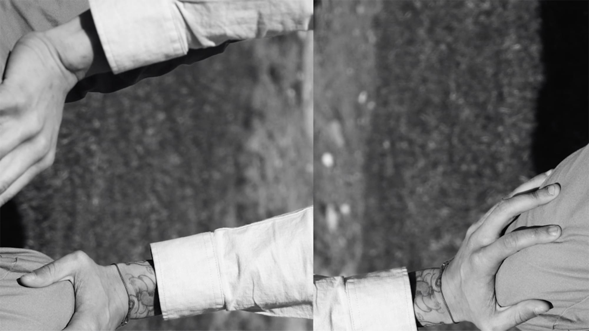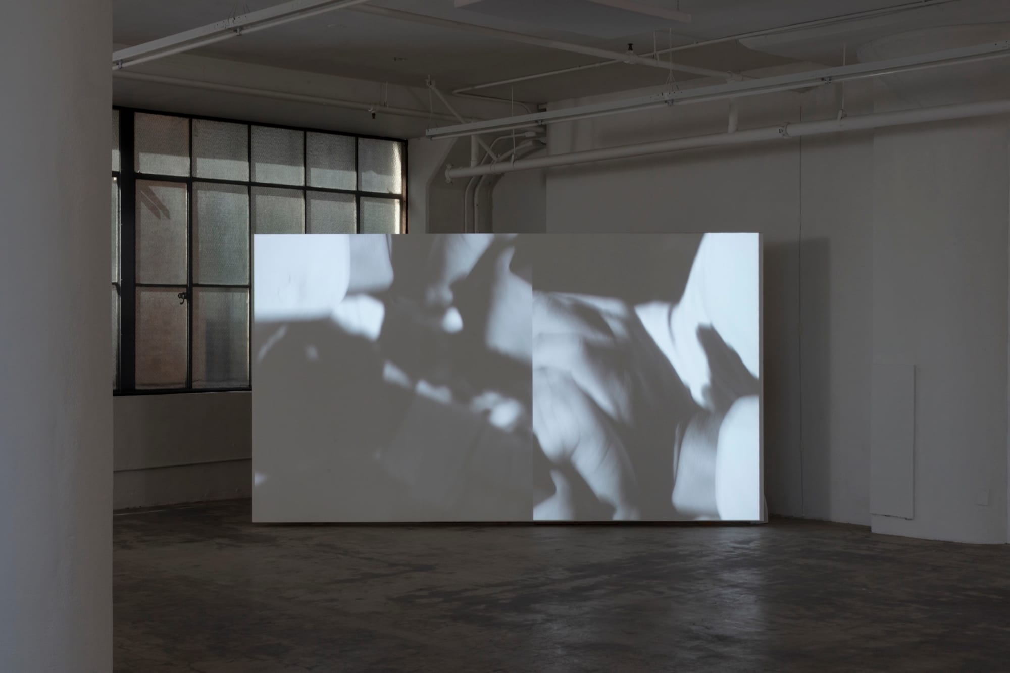 "In Succession" (2019) continues Jemison’s investigations into the resistive power of the abstracted space. In the black and white video, four actors practice a loose choreography of stillness and support as they use each other’s limbs to form a human pyramid. Presented in a split-screen format, Jemison rotates the two images so that their tops now meet in the middle, expanding the filmic space instead of fracturing it. The actors’ clothes, hands, and faces blur into each other, forcing the viewer to reorganize their sense of time and space.