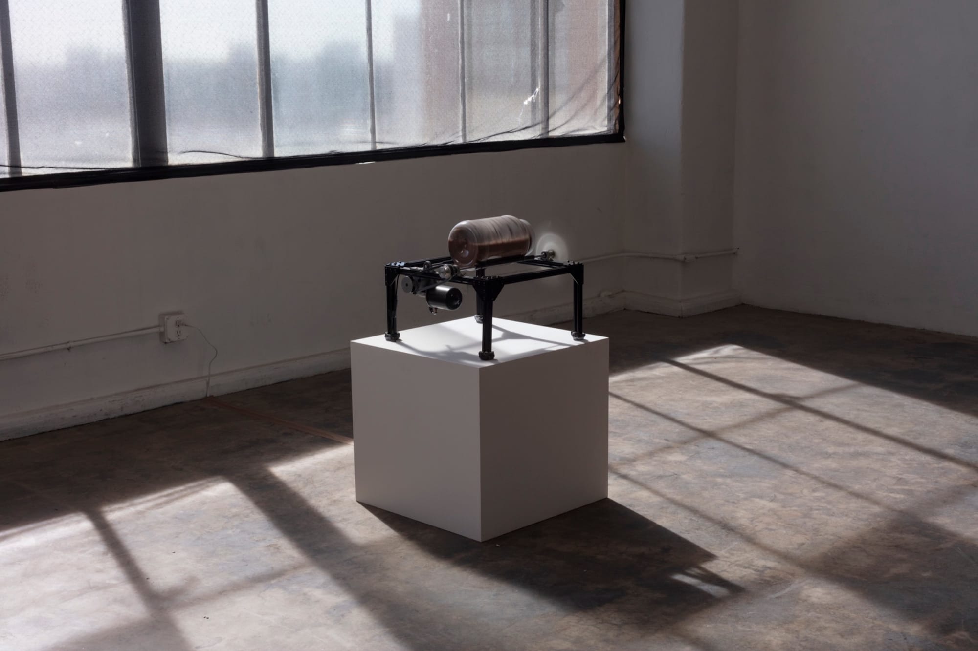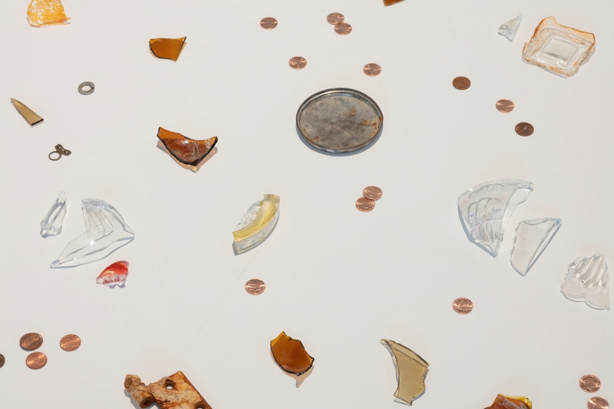 Jemison plays with JOAN’s industrial layout, leaning into its open qualities while also shifting the space to create hidden pockets. One of the drawings from an untitled series, which display sparse, gestural markings on found glass tabletops, is tucked away in a corner near the window. The audio of "Toss" (2021), a video created during the pandemic and the centerpiece of the exhibition, fills the gallery, making its presence known long before encountering its source. Its sound merges with the ambient drone of another work, a series of three sculptures called "Tumblers" (2021). Rock tumblers smooth out their contents, which are previewed on a shard-like plinth in the middle of the gallery, decorated with bits of ceramics, hardware, and pennies.