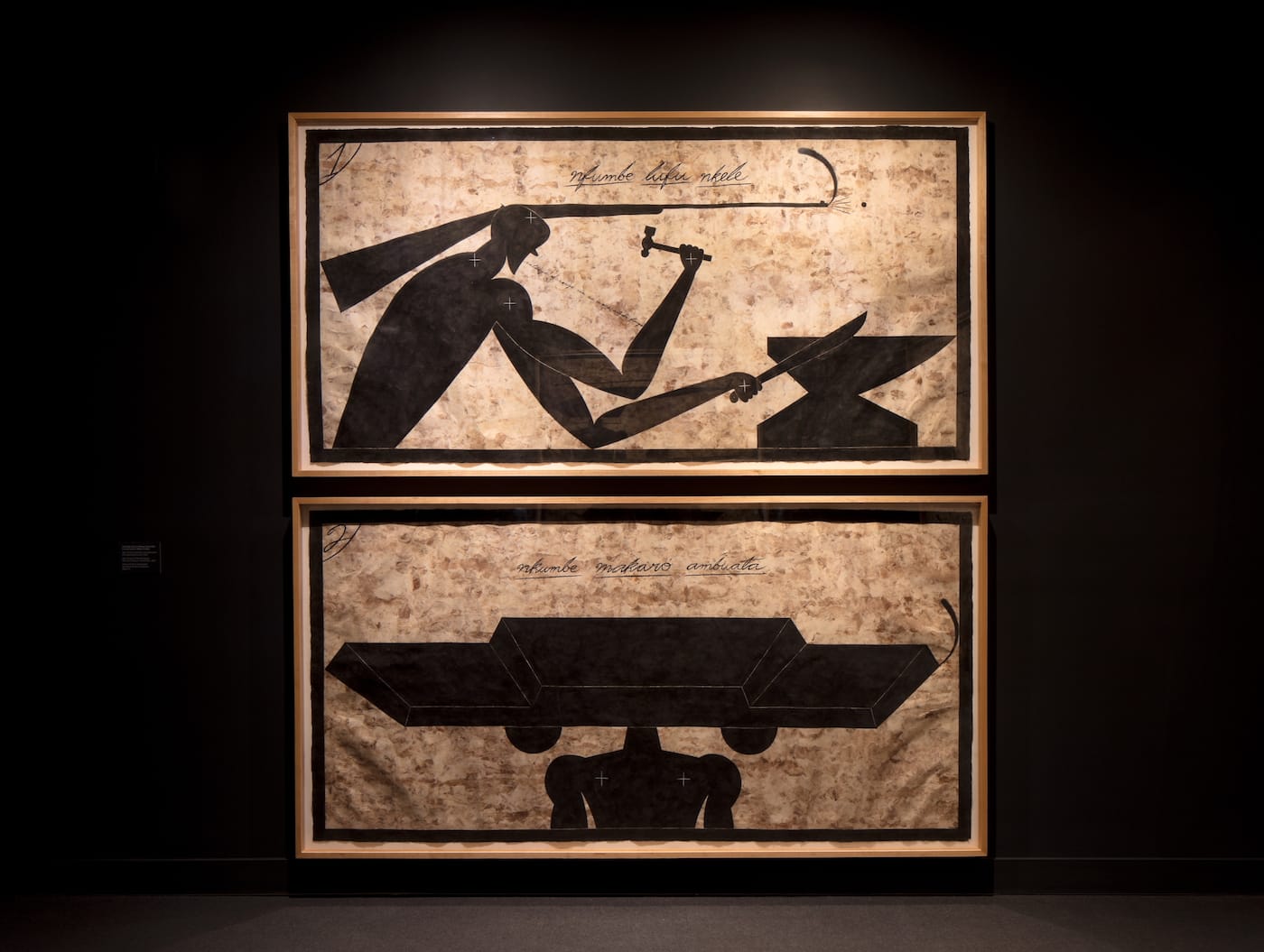 The links between Bedia’s Cuban heritage and its ancestral roots in West and Central Africa is revered in Fieldwork: drawings by Zambian artist Benfrey Chitofu (commissioned by Bedia) of the rituals of the Lunda people; drawings of symbols by Maliya Chitofu, Benfrey’s mother; a video featuring Makishi mask traditions and dances amongst the Lunda; a Makishi mask built by another Chitofu family artist, Charles; and, framing a doorway, a massive piece by Bedia featuring Nkuyo Nfinda, a deity in the Monte branch of the Palo religion. In Bedia’s “Nkuyo Nfinda Hunting” (2017), an onyx-colored figure stands on one side of the exhibition’s entrance, holding a rope that stretches over the archway to the other side, where it grasps the hooves of a donkey made of sand and reddish tukula powder. Many of the larger works on paper contain silhouettes of animals that seem both human and animal, orisha and man; here, they come to life.