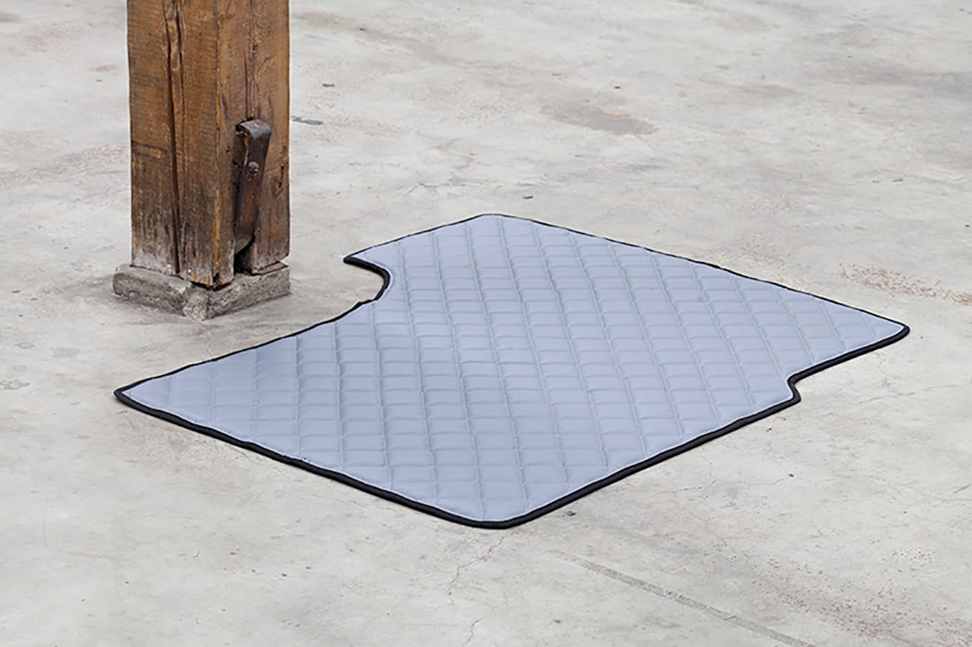 “Truck carpets” make up an ongoing series of site-specific installations realized by the artist in multiple venues including in 2015 at the SIC gallery in Helsinki, and most recently at Vermilion Sands, in Copenhagen. It consists of a series of truck carpets installed close to architectural features (parapets, pair of columns, etc.), which meld in a poetical juxtaposition of forms, colors, and materials, harmoniously coexisting in one visual moment. It is almost as if this association has always existed as we see it, and the elements, which constitute the work, were designed to align the way the artist has positioned them. Our role as visitors is to witness this encounter, to perpetuate the uniqueness of this status. What happens in his work is an embrace encouraged by a practice wherein opposing forces unify each other, giving life to a visual “oxymoron” that is aesthetically possible, even if ordinarily not acceptable.