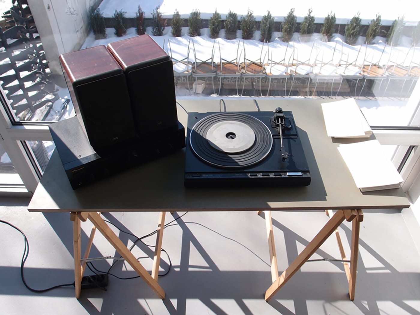 The work, which best fits this idea of harmonization within conflict scenarios is “Julia’s Wild,” which Kuorinki realized in 2012. It consists of a seven-inch record made out of concrete containing a reading of Louis Zukofsky’s 1960 poem, “Julia’s Wild.” In this case, the visualization of this idea is dramatized by a nagging physical response felt when the record needle scratches the rough texture of concrete, which, because of the fragile nature of the small components, risks breakage. This dialogue of materials conflicting, one against another, is fundamental to how this work represents through formal strategy and visuality, the possibility of creating harmony even if all that surrounds pushes the object towards its destruction. That is, in fact, what happens when a delicate poem barely sounds from the speakers, competing with the sound of a record being scratched, instigating a formal and conceptual polarity where opposing forces find mutual dependence, even in radical and hostile environments. By contemplating this mechanism, that allows harmony to manifest through opposing interpretations, Kuorinki proposes that there all the different efforts to belong, integrate to build a context. A place formed through conflict alongside coexistence. The record player’s needle resists the record’s roughness, just as the “man without a past” faces the hostile community, and much like — back in the real world — where migrants help create new communities in old places.