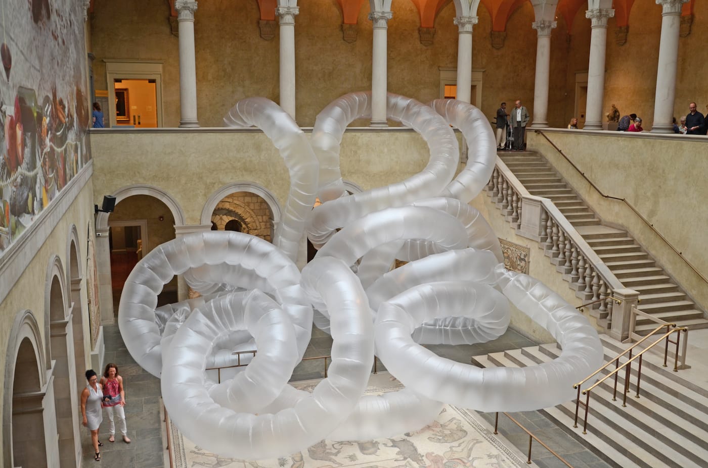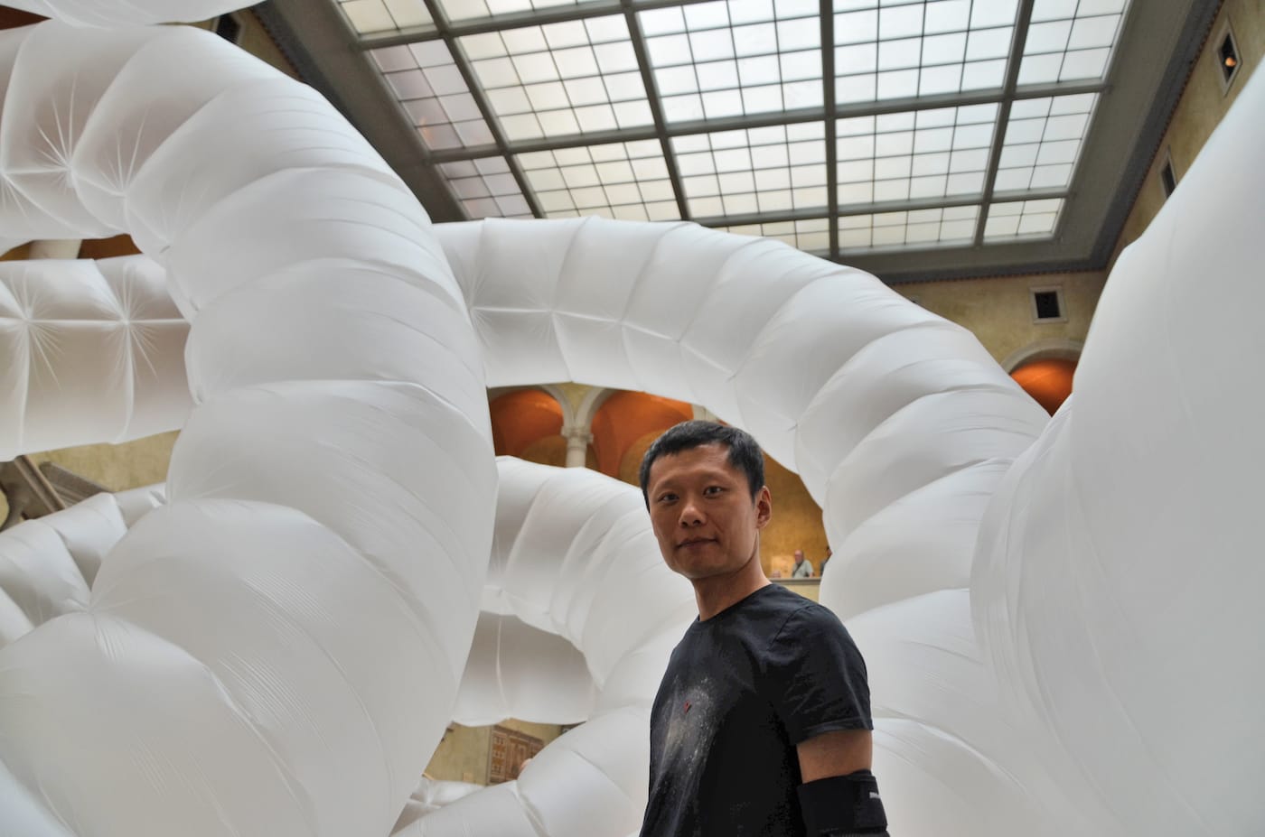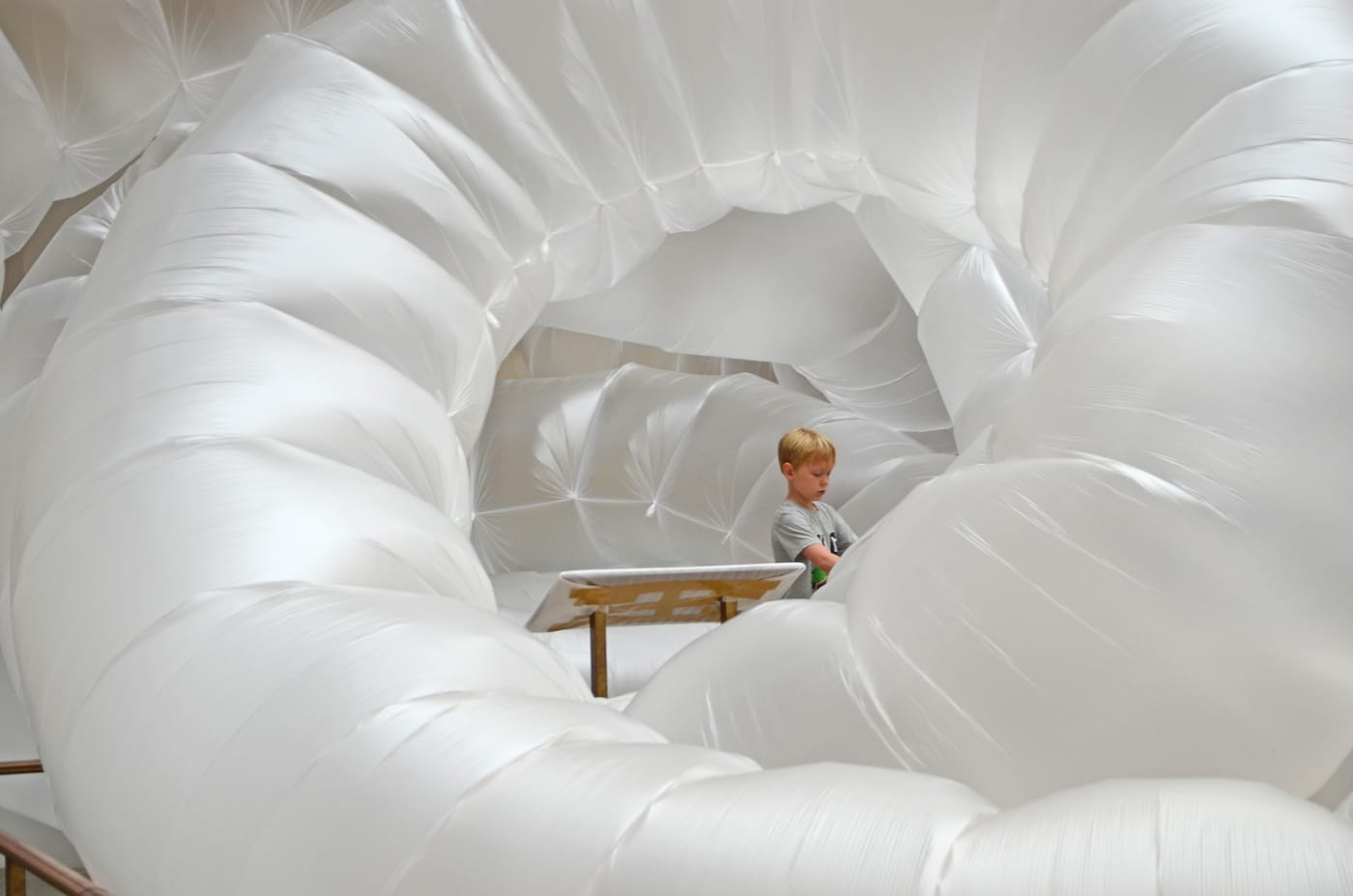This was the latest iteration of “Organic Concept,” a series of performances by the New York–based artist in which he pumps up a continuous roll of painter’s plastic with a box fan, bringing to life a room-sized pneumatic sculpture that resembles the braided contours of human viscera. “When you see the air trying to squeeze through, it makes you think of the lower intestine,” Huang told me earlier that day. “It’s almost like there’s food in there and it’s trying to get it out through the ends.” Fifteen minutes into the performance at the Worcester Art Museum, this monumental tripe was all but destroyed by a stampede of screaming children, who gleefully vanquished the wormlike menace.
