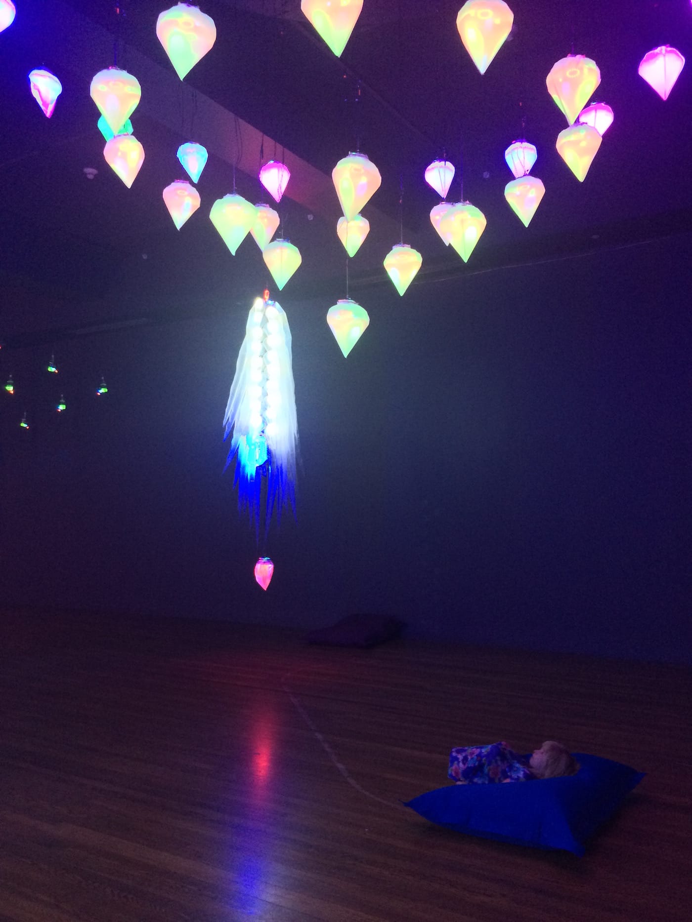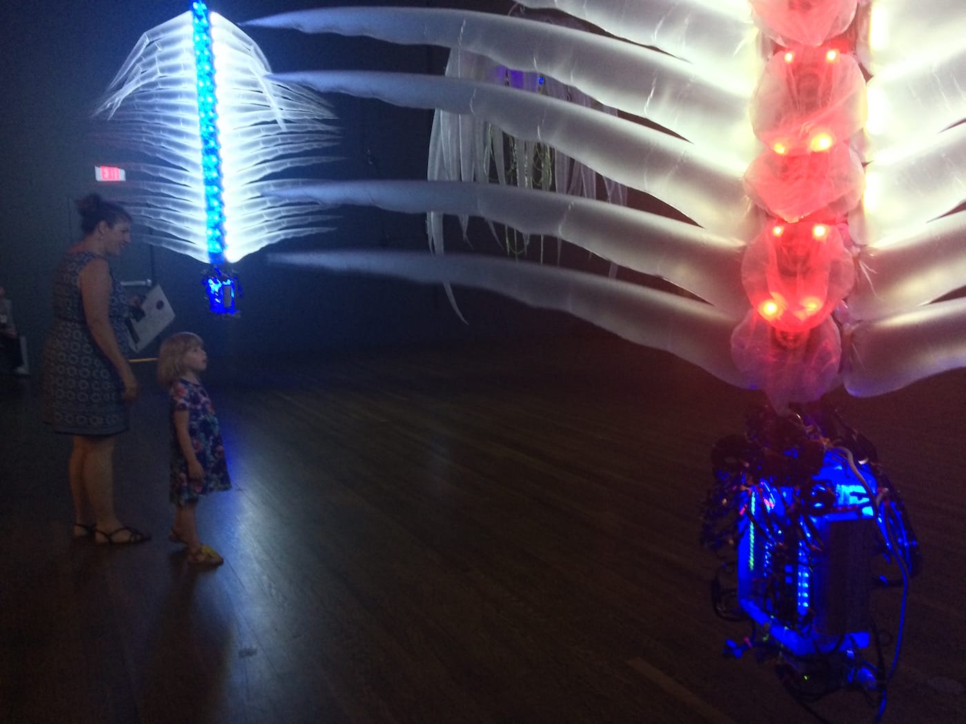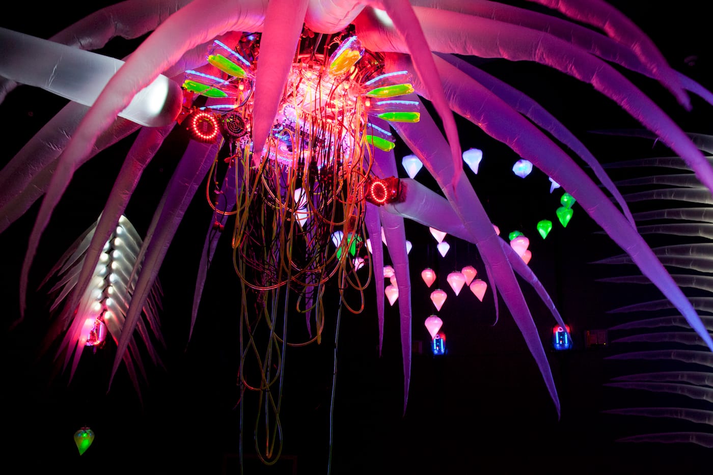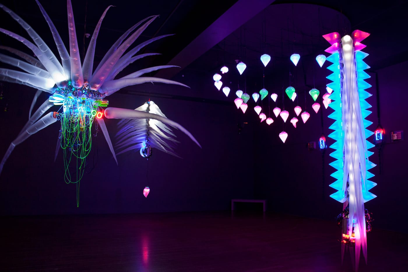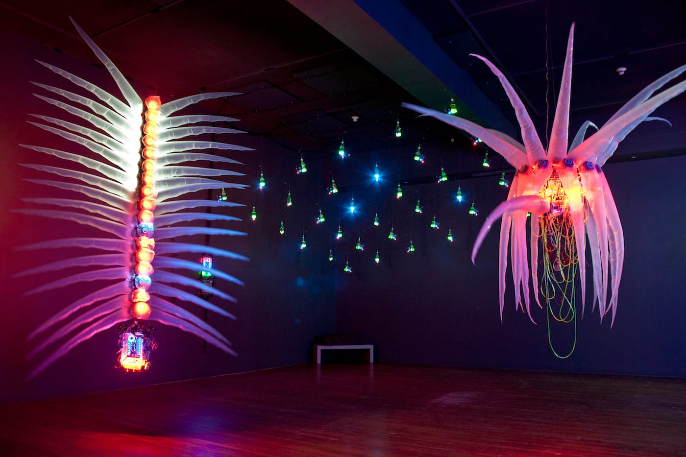 At the Worcester Art Museum, Shih Chieh Huang has assembled bioluminescent kinetic sculptures made of dollar store materials.