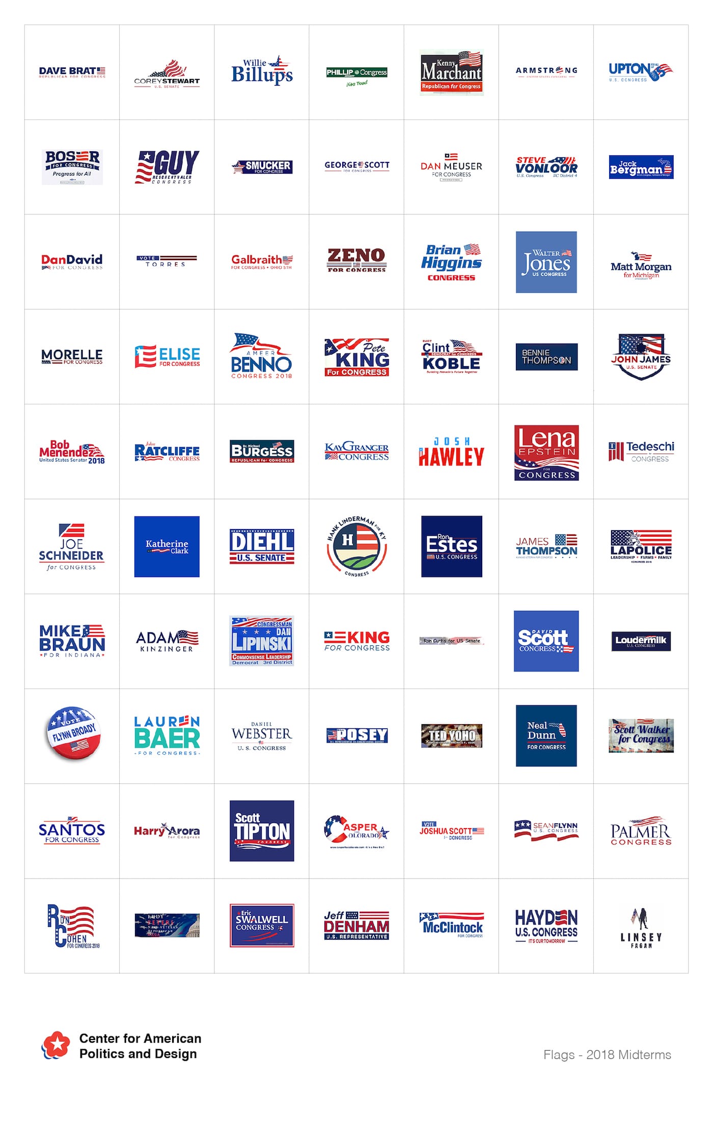 Stare at the logos of congressional candidates too long and it’s akin to sun-gazing. Everything goes blurry and homogenous. When I try to imagine them, I see blues, reds, an occasional #1EC635 green, a shooting star, a puffy Helvetica. Nothing more. Maybe the mercilessness of the last few months has got me despondent, or tired; maybe I’m not a particularly “visual person.” But the nuances of their imagery don’t register.