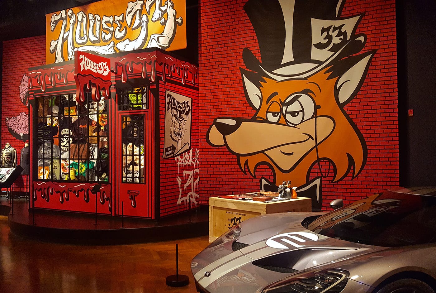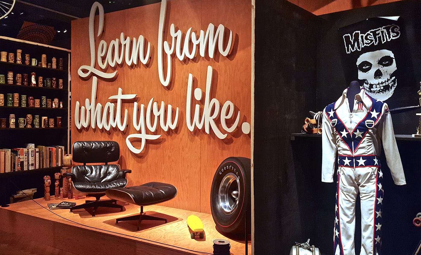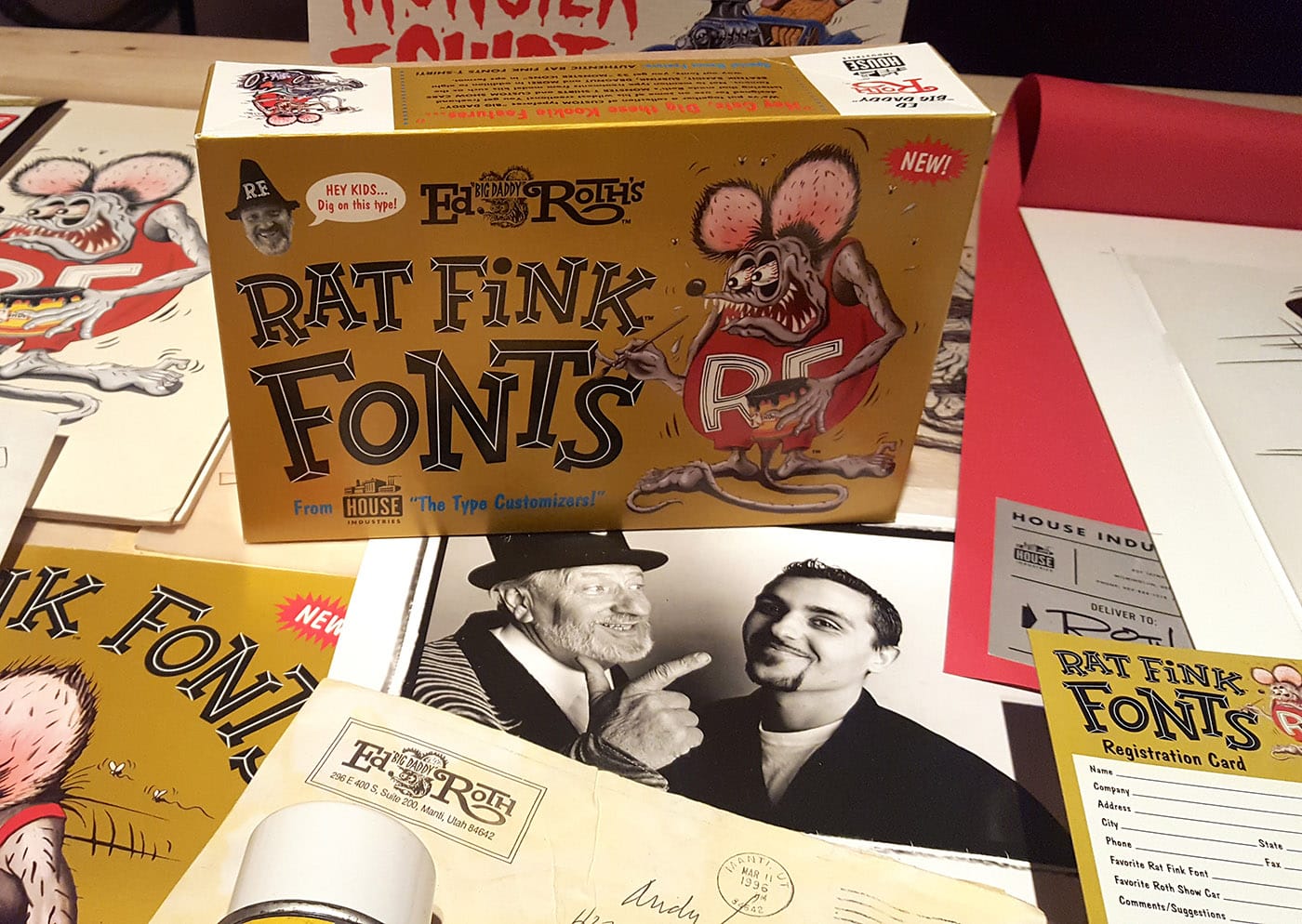 “What I think we’re trying to do … is show the stuff that influenced us, that turned us on to design, form, color — just that aesthetic experience that you just don’t want to lose,” said Cruz. The exhibition begins with the pop culture artifacts of great significance to the House crew, including a Misfits poster, an Evel Kenevil jumpsuit, an old-school LEGO set, and a Tom Servo puppet from Mystery Science Theater 3000. One section chronicles Cruz’s eye for hot rod cars, showing a progression from the classic hot rod that was his father’s passion project and point of inspiration for Cruz as a young man, to Ed “Big Daddy” Roth’s futuristic Mysterion show from the Henry Ford collection; in 1997 Cruz began a collaboration with Roth to develop a specialized font for the Rat Fink brand. One of House’s latest automobile projects is the font and custom paint job on the dash display of a 2017 Ford GT supercar. It’s a literal object lesson in Cruz’s evolution from being a fan of pop culture to being a part of it.