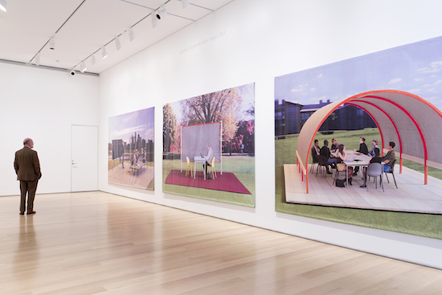 The show is anchored by three large-scale, 12-by-8-foot billboards (seen at top) that present possible designs for outdoor workspaces. In one of the images, workers sit in office chairs around a long table. They are sheltered by a half-circle canopy structure. The weather appears fall- or spring-like. It must be, because otherwise the people depicted in the rendering would be wearing more than just long-sleeve shirts. In another image, a man sits on a yellow chair at a white table outdoors in a field. He is hunched over a laptop. A single screen protects him from the natural elements. If it rains on this man, well, that’s too bad for him
