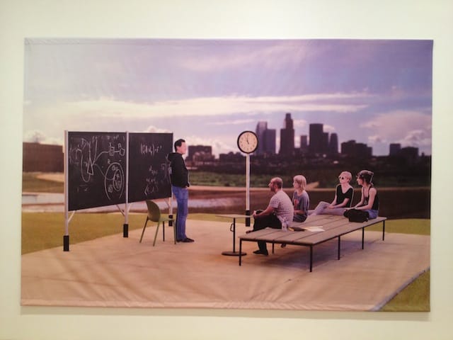 On the opposite wall from the billboards, viewers see excerpts from Olivares’s research on the outdoor office. Scenes include Anna Lora’s portable outdoor classroom (2010), a Monty Python film still of a man sitting at a desk on the bank of a river (1969), and a 1945 image of the signing of the surrender of Japan at an outdoor desk. Like an artist displaying their sketchbook, this collection of images feels like a peek into Olivares’s brilliant mind. Through these scenes, he points out the obvious: The outdoor office isn’t actually a new concept; it’s just not something the corporate world has seriously considered.