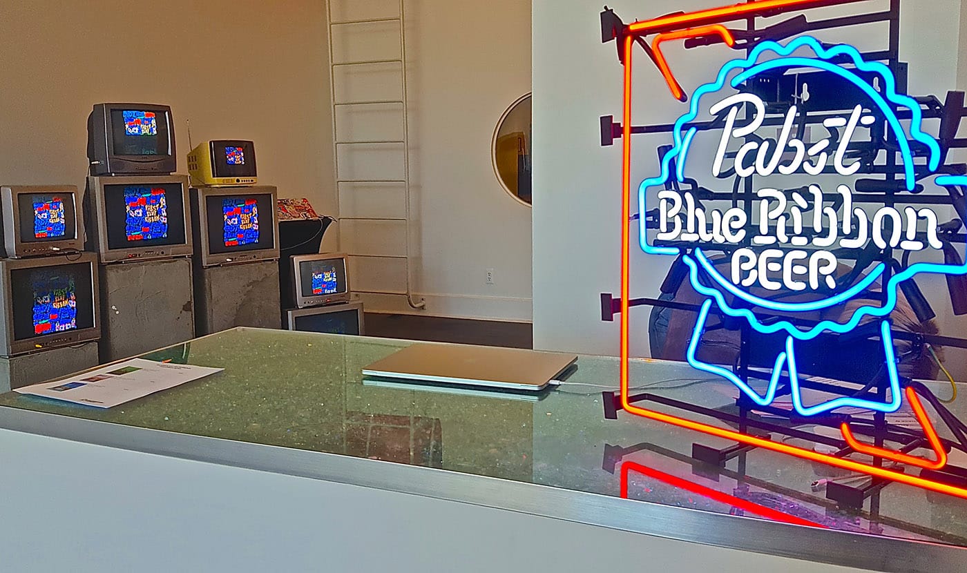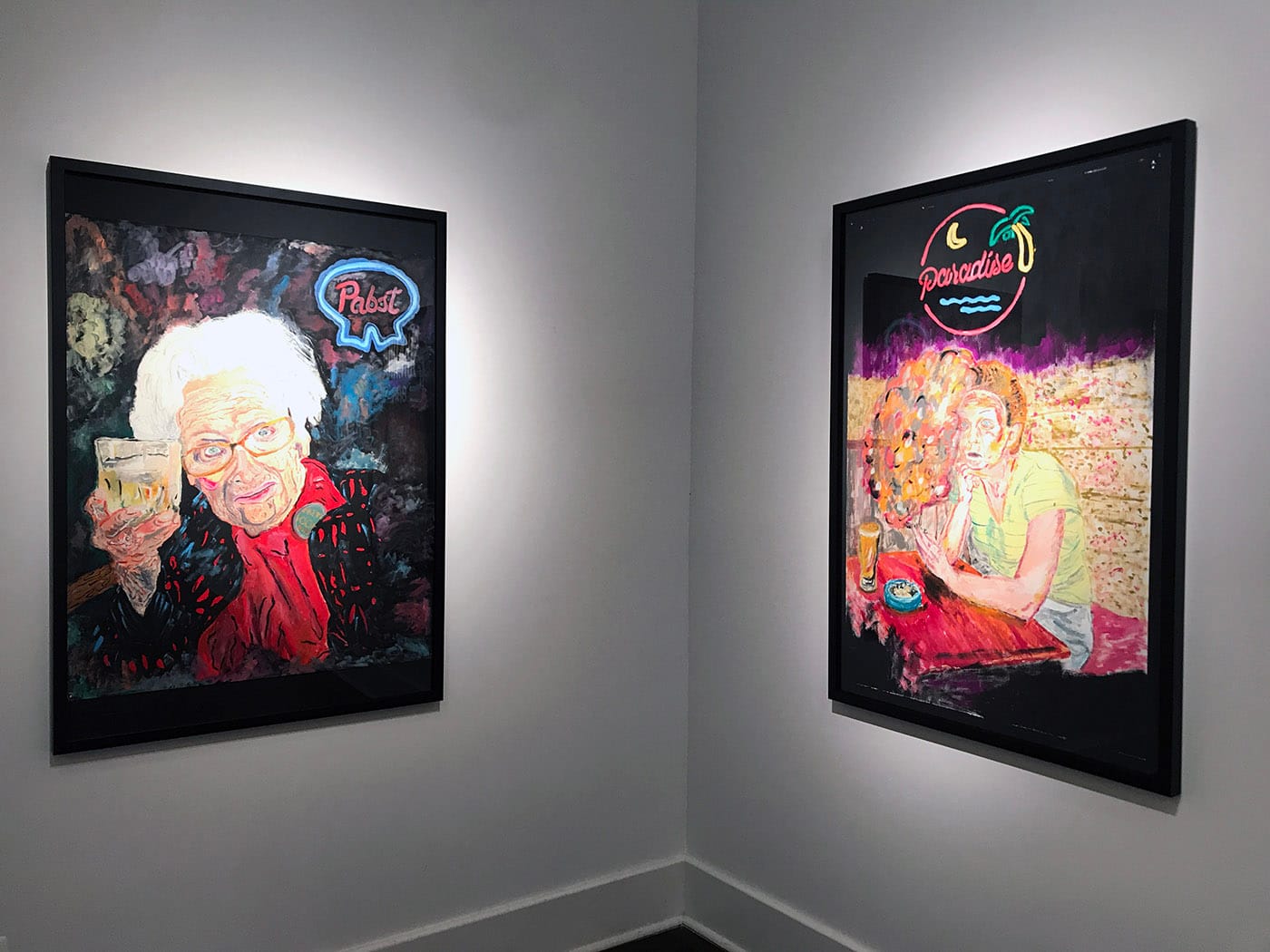 This exhibition is one of contrasting interests, beginning with its coincidental installation at Playground Detroit in conjunction with a party that features a set of GIFs specially commissioned through the venue by Pabst Blue Ribbon. Upon entering the gallery, one encounters a desk bearing a neon PBR promotional sign and a bank of televisions that are running a loop of 8 GIFs, presumably intended for repurpose in the promotion of the beer brand following their debut in this fine art setting. Though the synchronicity was unintentional, according to Playground co-director Paulina Petkoski, both the artist and the corporation were amenable to the idea of sharing the space. From the perspective of Bone’s work, it is painfully fitting that one might have to navigate a field of young, polished revelers gathered together around the promise of free booze in order to see portraits of people at the far less glamorous end of the public drinking spectrum. From PBR’s perspective, it’s surprising that the brand so readily agreed to share space with a portrait series that showcases the isolation of later-stage drinking. In fact, their primary concern, according to Petkoski, was that none of the works on display featured the logos of other beer brands.
