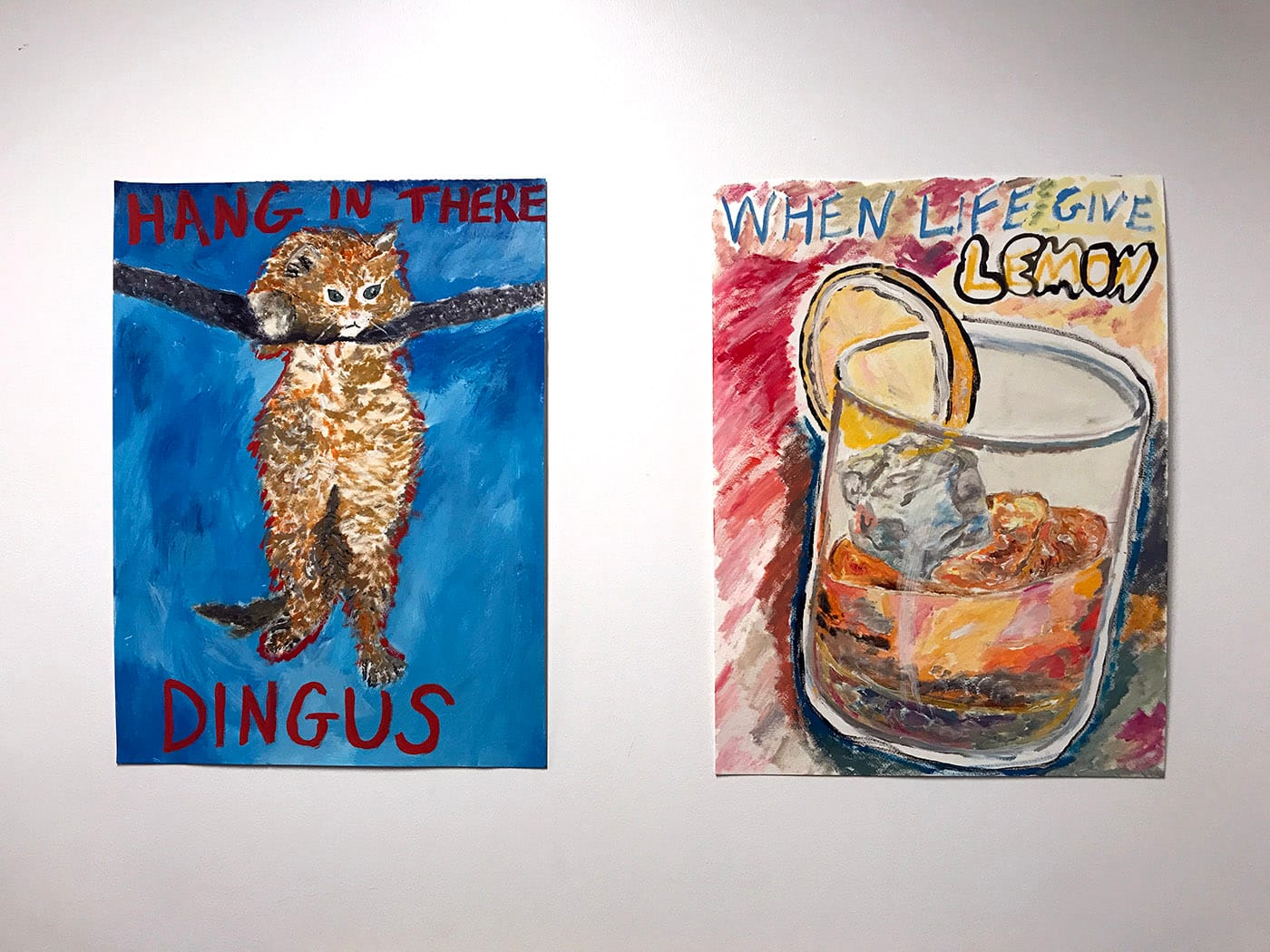 The tension between recovery and revelry in self-destruction fairly radiates from Bone’s works, and many of subjects appear to emit colorful smoke or steam — perhaps a literal take on the anachronistic nomenclature of alcohol as “spirits.” The portraits bear poignant titles that hint at this friction between self-awareness and delusion, presumably restating quotes from their subjects: “Time for My Medicine” (2018), or “Thanks to Denial, I’m Immortal” (2018). In a final coda to the exhibition, a set of two small works are hung around the corner in the gallery’s office, much like the motivational posters they impersonate. One presents the artist’s rendering of the iconic kitten hanging from a branch, with the exhortation to “HANG IN THERE DINGUS”, and the other reads “WHEN LIFE GIVE LEMON” [sic], finishing the phrase with an image of a rocks glass adorned with a lemon slice.