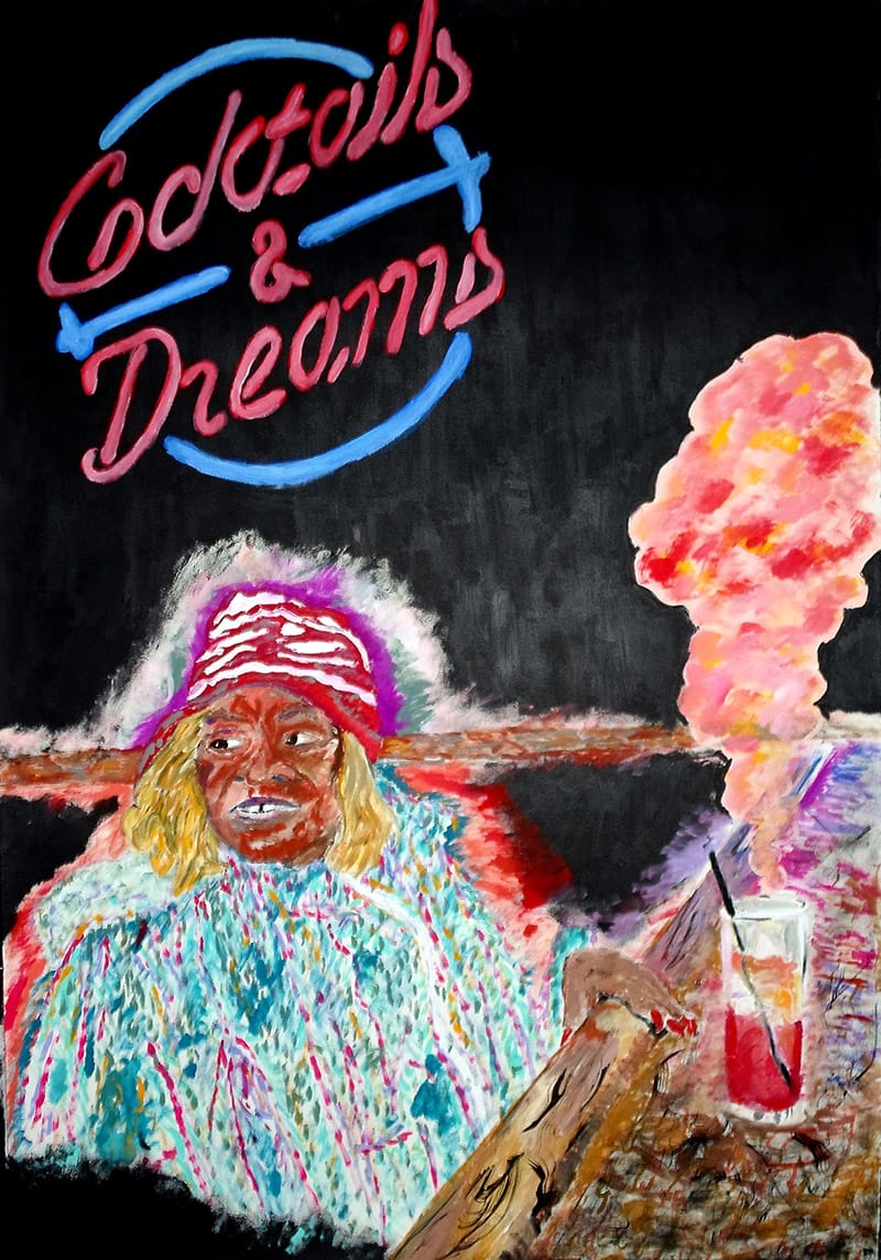Painter Thelonius “T-Bone” Bone supports himself as a bartender at the Bronx Bar — one of the longer-standing watering holes in Detroit’s Cass Corridor neighborhood, before it was rebranded as Midtown — and this creates an excellent vantage point from which to observe many such individuals. In a new body of work, Alcoholics Anonymous, Bone juxtaposes surreal and vivid portraits of bar patrons with object studies of drinks and other bar ephemera.