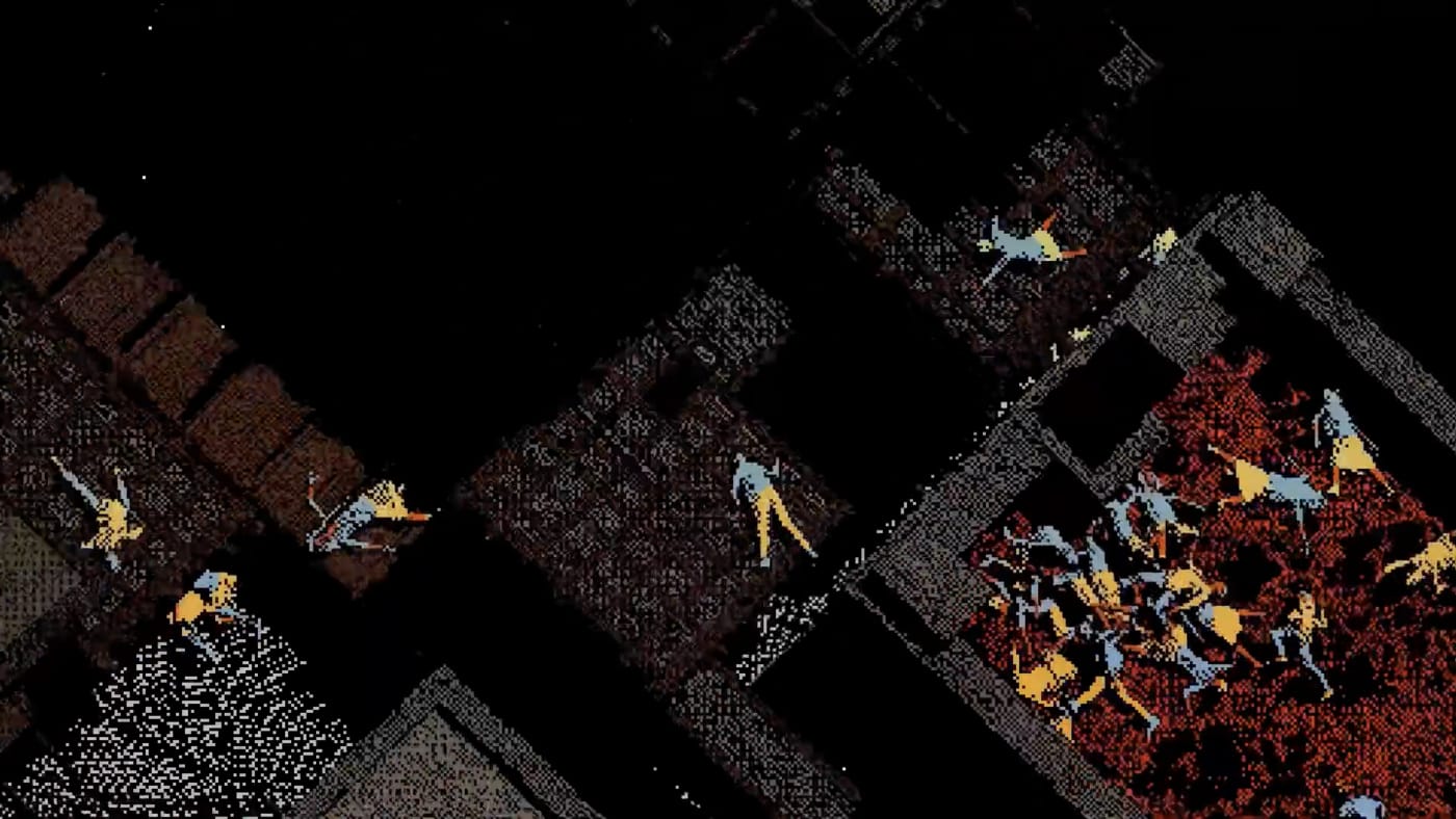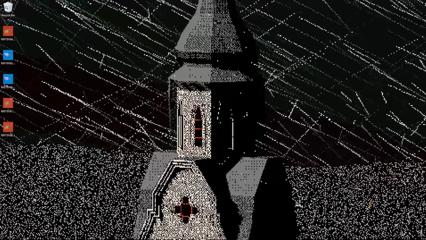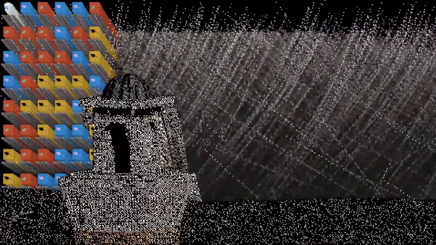When you launch the “DESCENT” .exe file on your desktop, a malware invasion of rats begins. At first only a few appear as ominous “RAT” image files. Then, as the glitchy static grows more intense, with a bouncing movement reminiscent of pestilent fleas, the steeple of a church emerges from the pixelated forms. Soon the rats become a plague. The human figures wandering the strange, fluctuating landscape undergo a cycle of life and death.