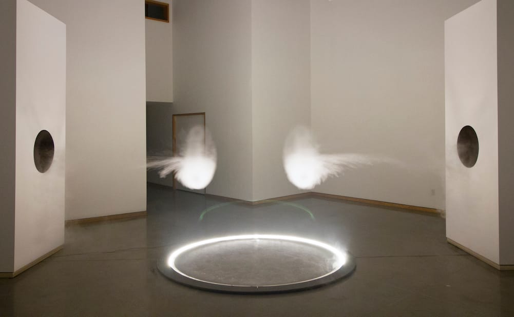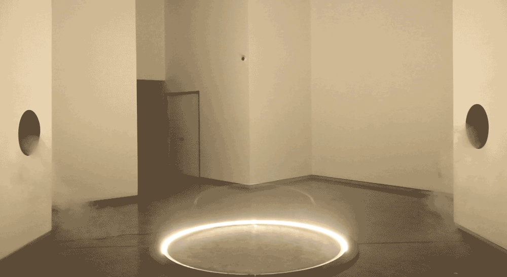 Chan set “Infinite Newsfeed” as the backdrop to his installation “Something Something National Conversation (In 2 Characters Or Less),” which he describes as “a massive representation of discourse as spectacle without substance.” It consists of an endless cycle of a purposeless but mesmerizing action: two clouds of water vapor emerge from holes in opposite gallery walls and drift to meet each other over a dramatically illuminated ring, where they collide — and dissipate into nothingness.