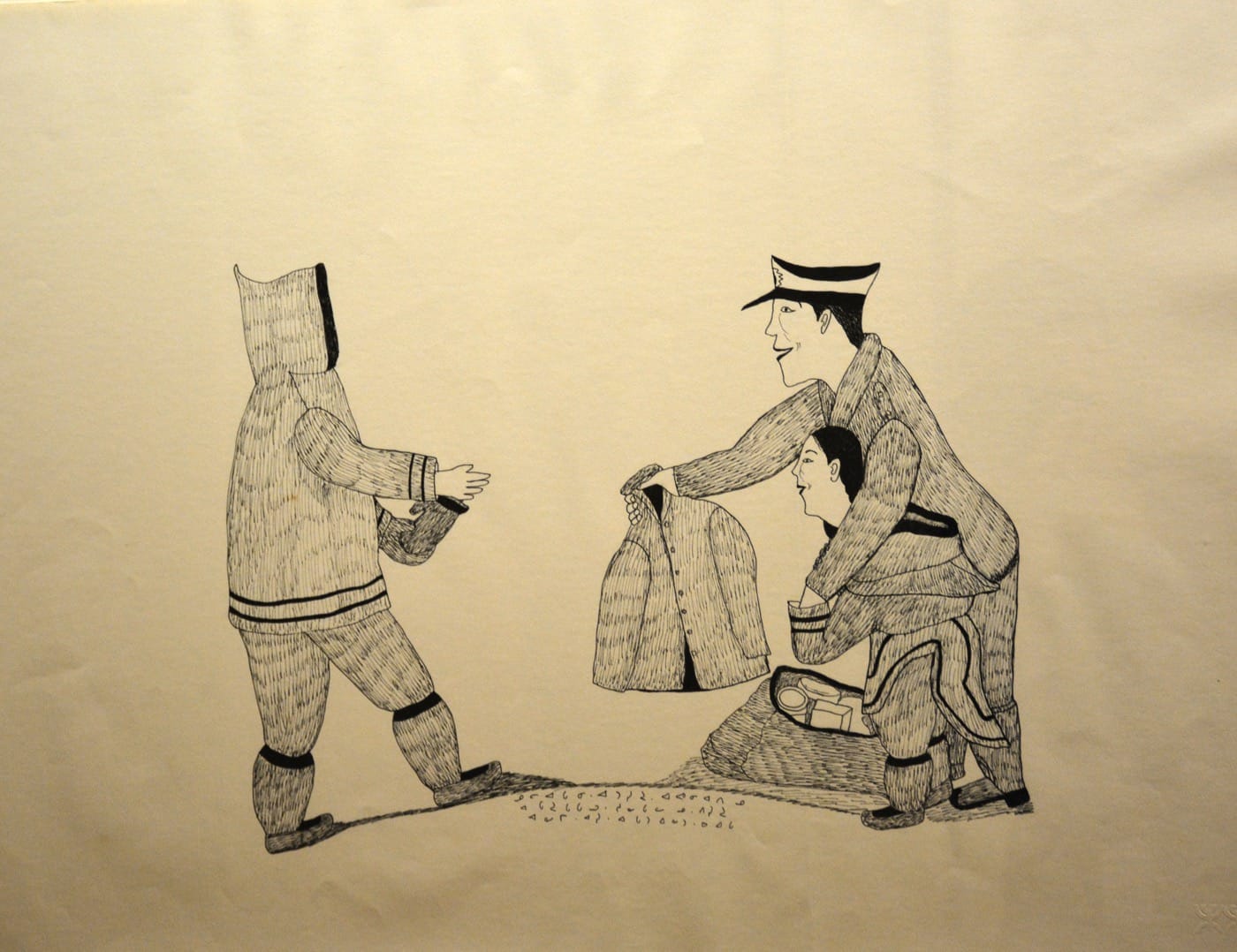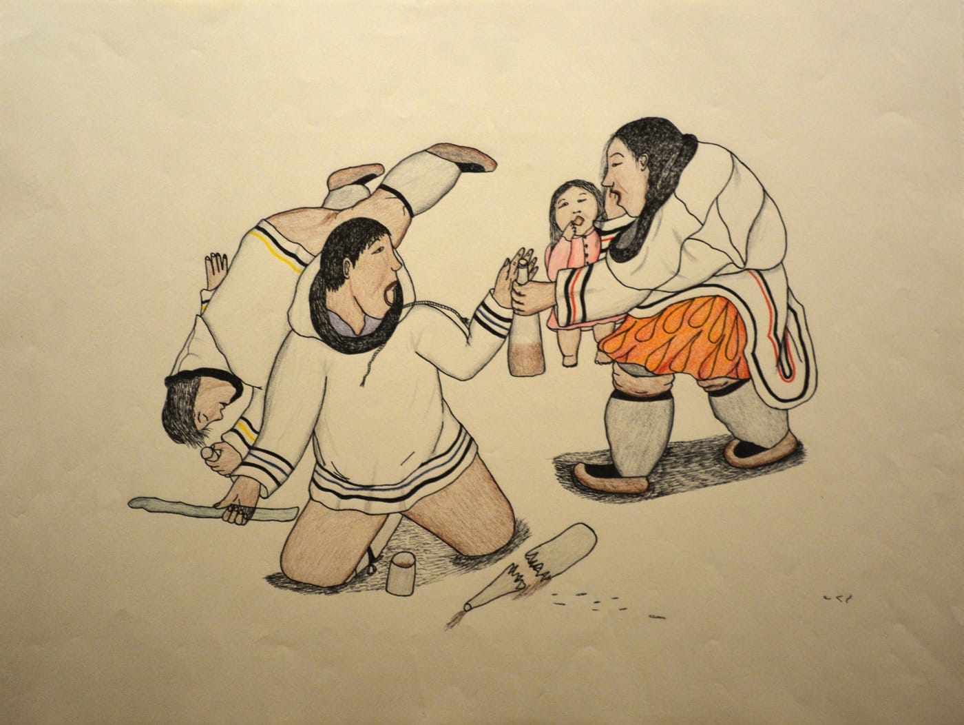 The tensions among such seemingly timeless subject matter, modern materials, and the production and marketing model of Dorset Fine Arts (the marketing division of the West Baffin Eskimo Cooperative) vexed anthropologists seeking to define from an outsider’s perspective “authentic” Inuit culture. But as Napachie Pootoogook’s work shows, Kinngait prints have never shied away from chronicling the flux of life in the North. Her work on display shows some of the darker aspects of a history that certainly do not fit the idealized image of an innocent, unrecoverable Arctic life. In “Trading Women for Supplies” (1997-98) and “Whaler’s Exchange” (1989), women are given to Euro-American sailors in mercantile transactions of sexual exploitation exchanged for supplies. Cannibalism is the subject of “Eating His Mother’s Remains” (1999-2000), a practice that, while not part of Inuit culture except in case of extreme famine, has been projected onto many indigenous cultures throughout history. “Alcohol” (1994), depicting a group of figures reeling, with several bottles strewn about them, demonstrates Pootoogook’s foray into particularly contemporary issues that were not necessarily present in Ashoona’s work.