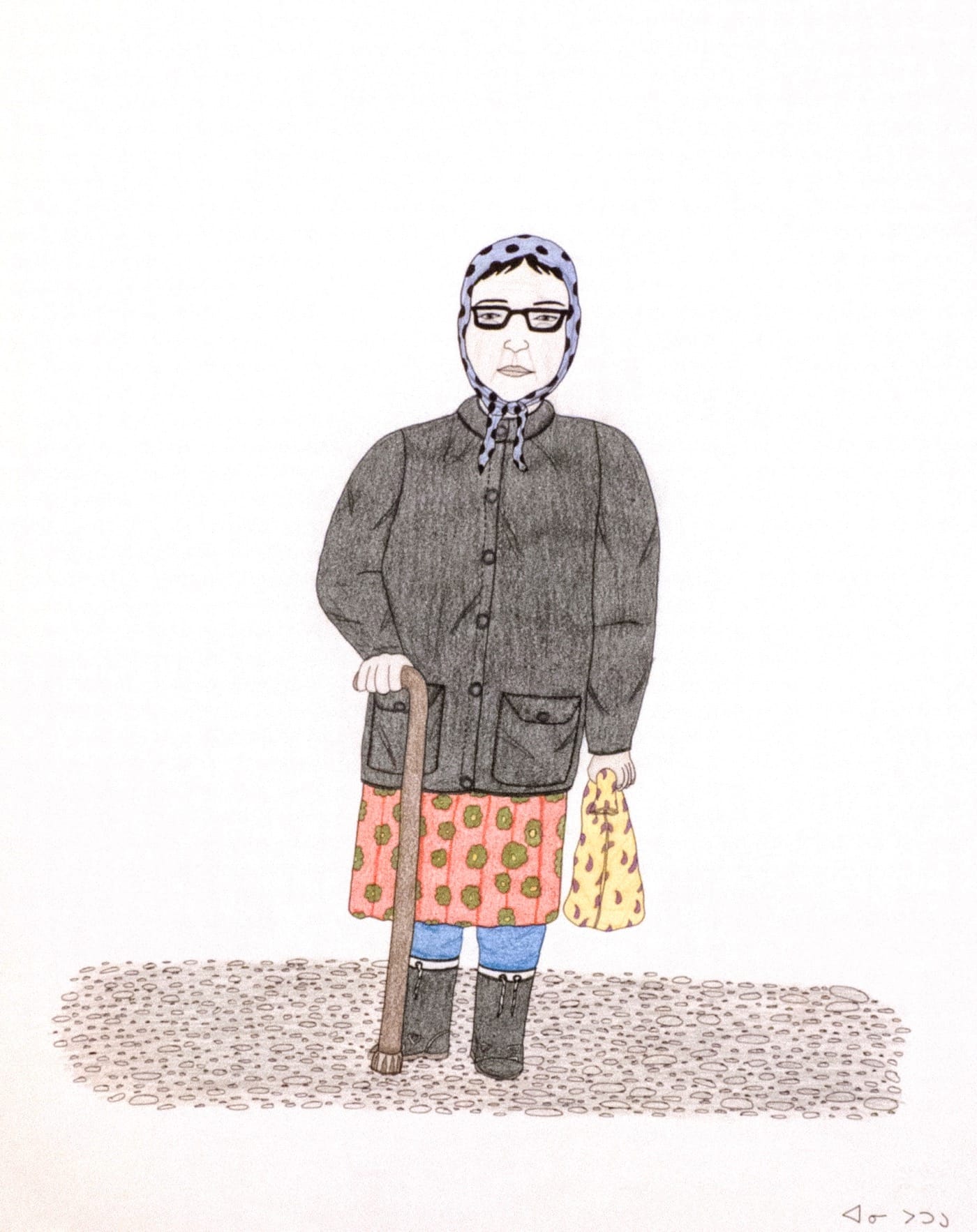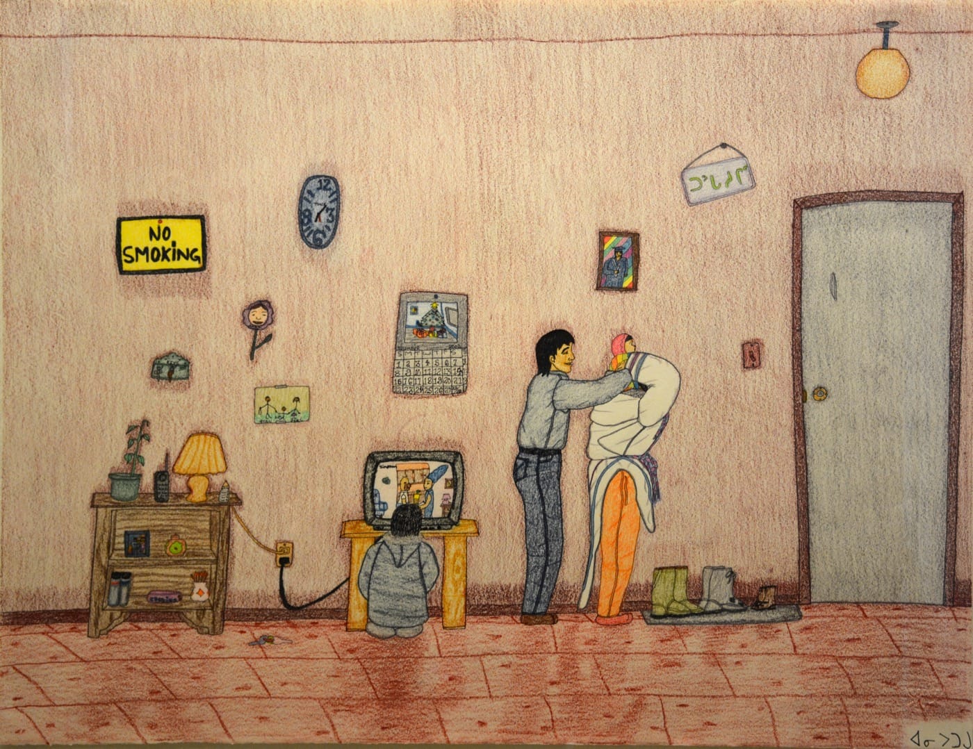 The bands of color in “Couple Sleeping” (2003-04) demonstrate how sensitively, with her colored pencils, she treats the same paper used for Kinngait prints, creating an alluring surface that recalls the starry texture of Ashoona’s early prints. It is the epitome of an Inuktitut word sometimes substituted for art, sanattiaqsimajut: “these things that are finely made.” “Watching the Simpsons on TV” (2003) is an intimate and lusciously detailed domestic interior scene of family life that fills the page with details of a contemporary Inuit experience. It is a stylistic break from the isolated Inuit figure as seen in the work of her mother and grandmother, yet she also draws on that heritage. “Pitseolak’s Glasses” (2006) depicts her grandmother’s eyeglasses in a near-abstract manner that is reminiscent of engraved ivory forms. And a portrait of Ashoona herself on an isolated white background, not wearing a point-hooded parka, but a patterned dress and headscarf, ties the three generations of the exhibition neatly together — akunnittinni.
