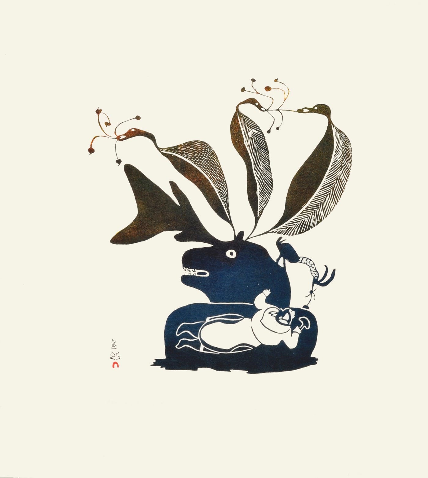 Work from Kinngait is not infrequently shown in New York. Most recently, in late 2016, the Brooklyn Museum presented programs with the Cape Dorset Legacy Project to supplement its collection of Kinngait work from the 1950s to the present. It is also a major moment for Inuit artists internationally. Kananginak Pootoogook, a family member and one of the first Kinngait printmakers, is now the first Inuit artist to be shown at the Venice Biennale, having been selected for this year’s Arsenale exhibit seven years after his death. Closer to home, the exhibition SakKijâjuk, organized by Heather Igloliorte — the first major show of Labrador Inuit art — is now currently touring across Canada.
