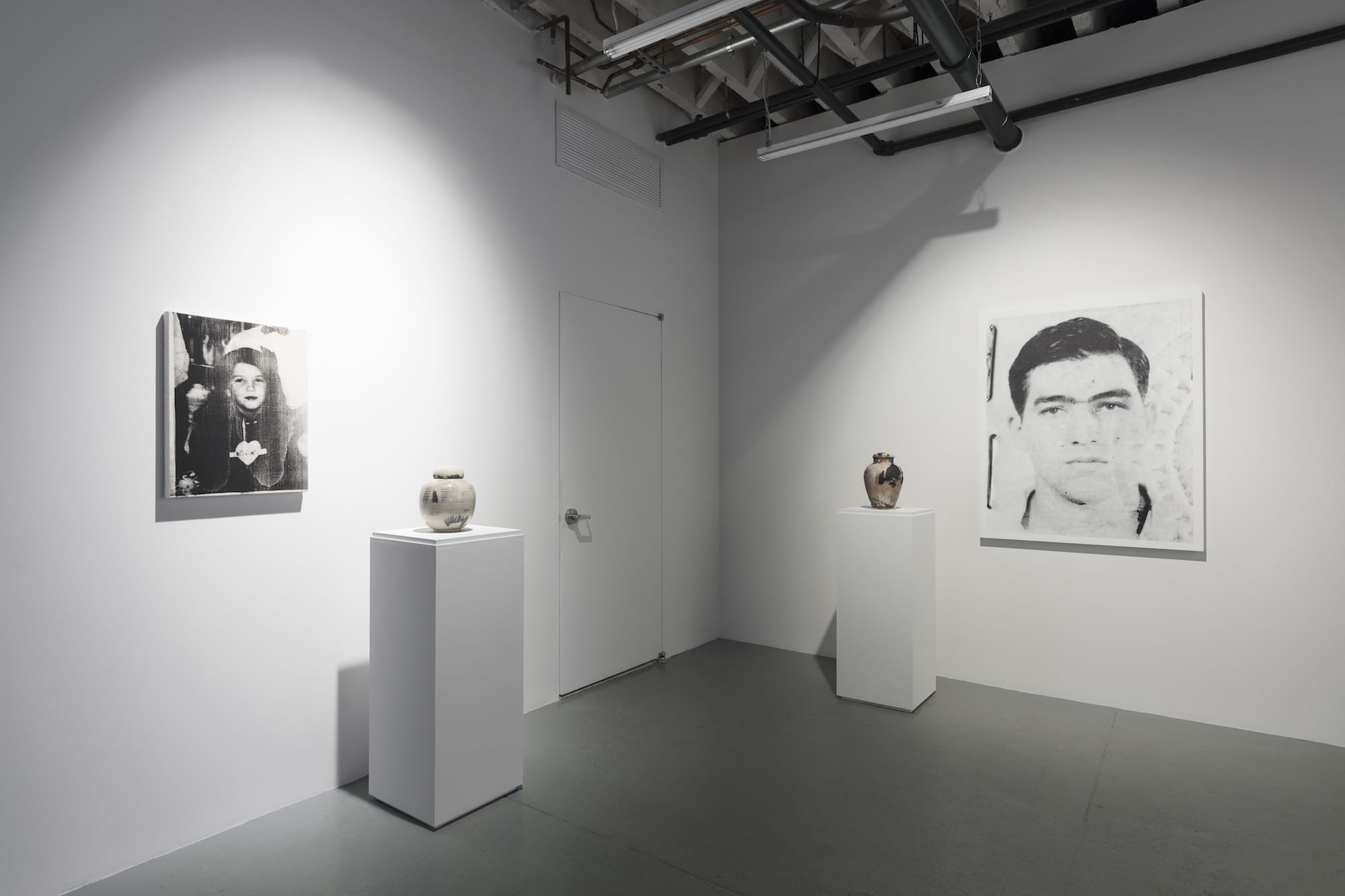 In the back room, two ceramic urns accompany two screenprinted photographs — of Ericsson’s mother as a child and her father as a young man in the Merchant Marines during WWII. The urns are modeled after the real ones used to store each relative’s ashes. In making the screenprint of his mother, Ericsson incorporated some of her ashes into the medium, and inside the urn, he placed a small bone fragment. He did the same for his grandfather, working his ashes and bone fragment into his own portrait and urn. On the opposite wall, a bronze cast of one of the grandfather’s pin-back buttons reads: “I want your body.” Next to it, a bronze cast of a letter opener he’d made from bullet casings during the war is superimposed with words from letters Ericsson’s mother wrote to her son about her father.
