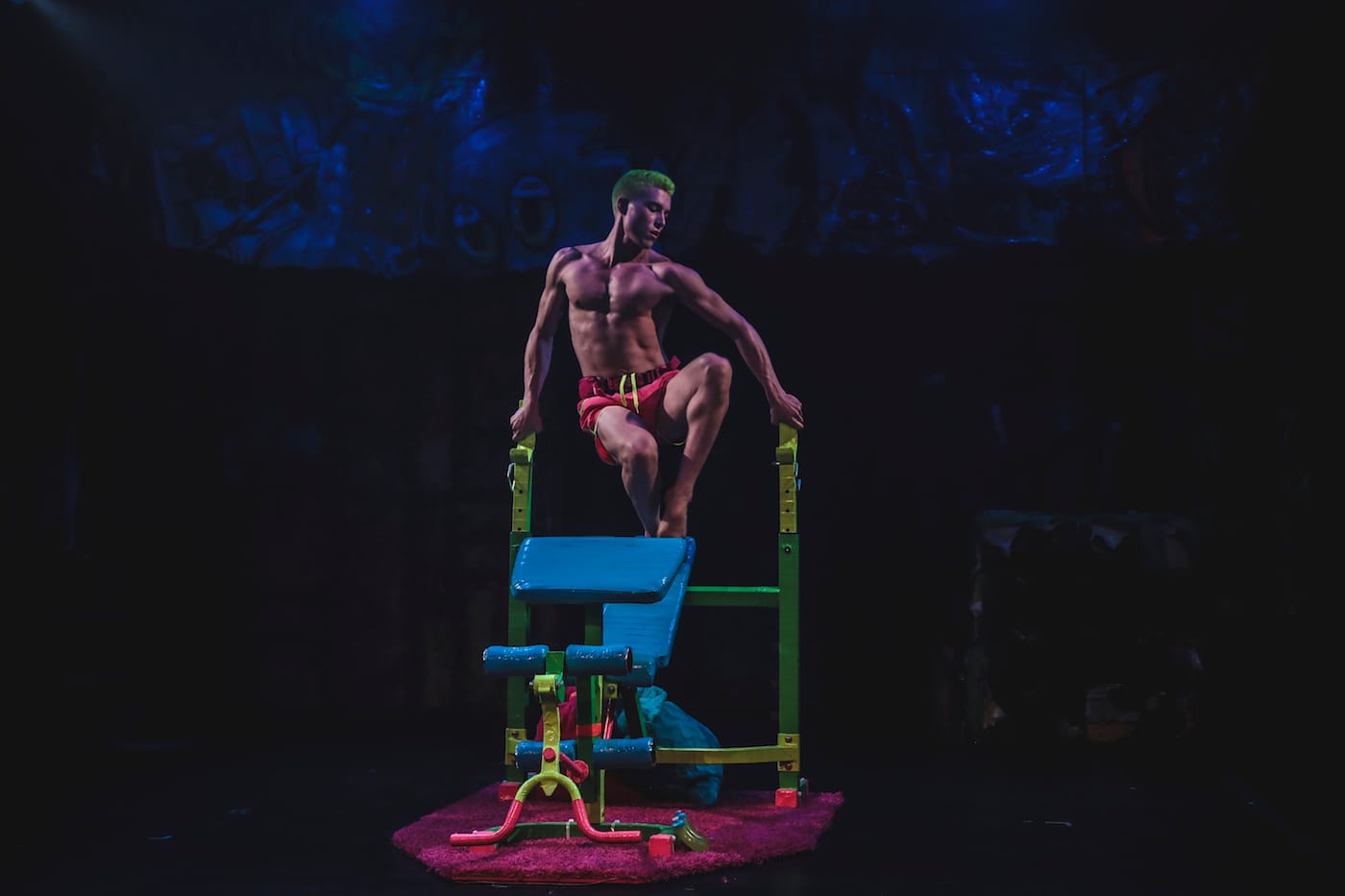 At this point, I may have blacked out so I don’t really remember how the next act begins. All I know is that neon gym equipment was carted onto the stage as the ripped dancers pretended to struggle with five-pound weights. But not to fear. This number’s central performer, Avi Borouchoff, slowly relinquishes his remaining clothes in favor of body oil. Not sure if this helps gain traction on the bench press but it’s definitely amusing to watch. Weightlifting doesn’t last for long because the free weight rack also includes a couple massive dildos. (In case the reader couldn’t tell, this number examines the “gym bunny” stereotype-kink of gay men who really love to exercise.) Stunned, it’s probably at this moment that I noticed across the stage from me a mother bopping along to the music with her politely observant tweenage daughter. Oh, to grow up in the East Village having seen it all — from every angle.