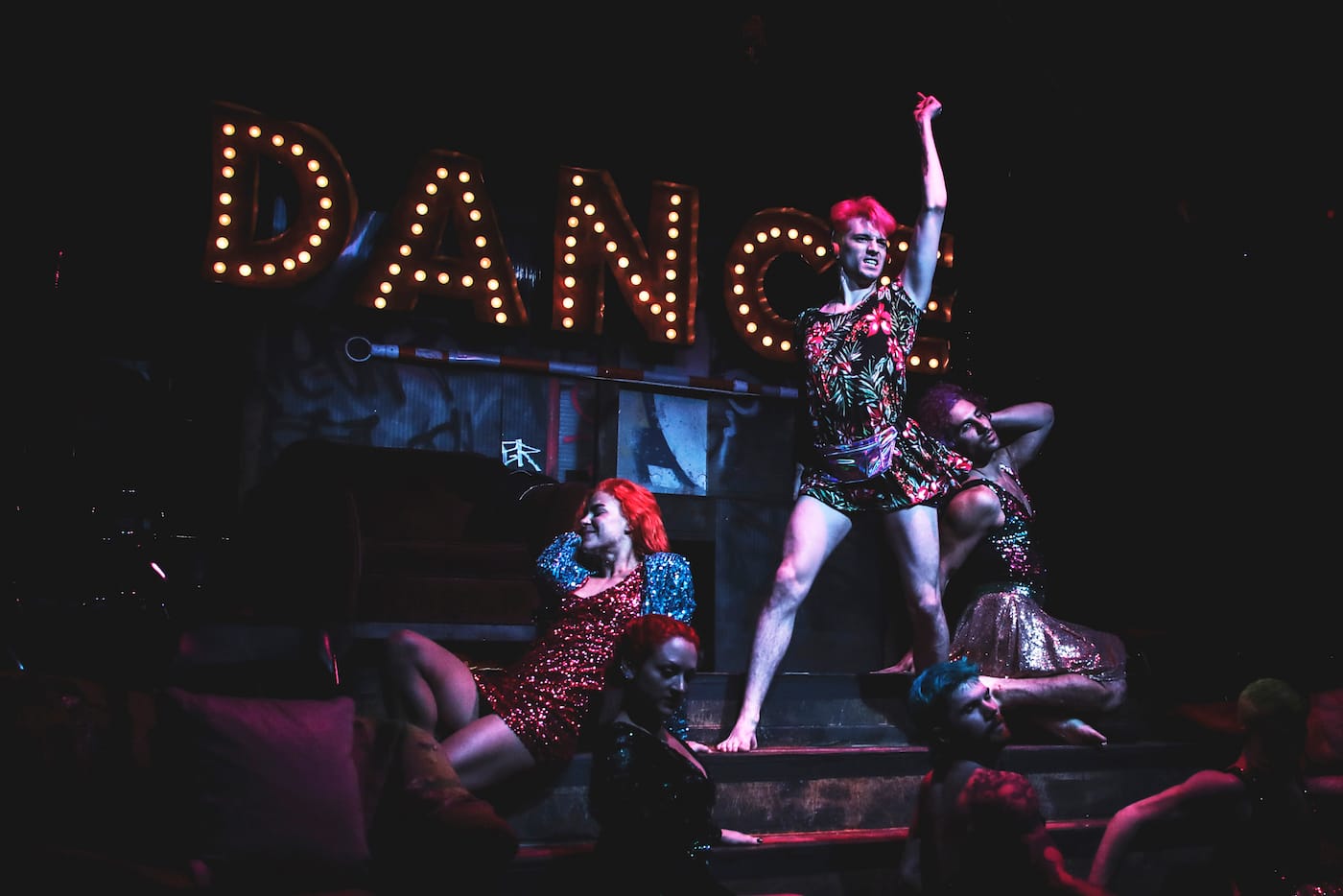 Enter dancer Dylan Krepp, listening to an instructional audio tape on how to be gay as he sorts through the women’s clothing he wants to wear. Running through some fast and (very) loose definitions of what it means to be gay, trans, and a drag queen, the audio guide soon ends with Krepp lip-syncing for his life to a perennial favorite, Bonnie Tyler’s “I Need a Hero.” (But let’s be honest, Shrek did it best.) The choreography here is glorious, triumphant even, with almost the entire cast rushing on stage to support Krepp’s coquettish performance — everyone except one dancer who has gone backstage to change into his gay-bashing uniform.