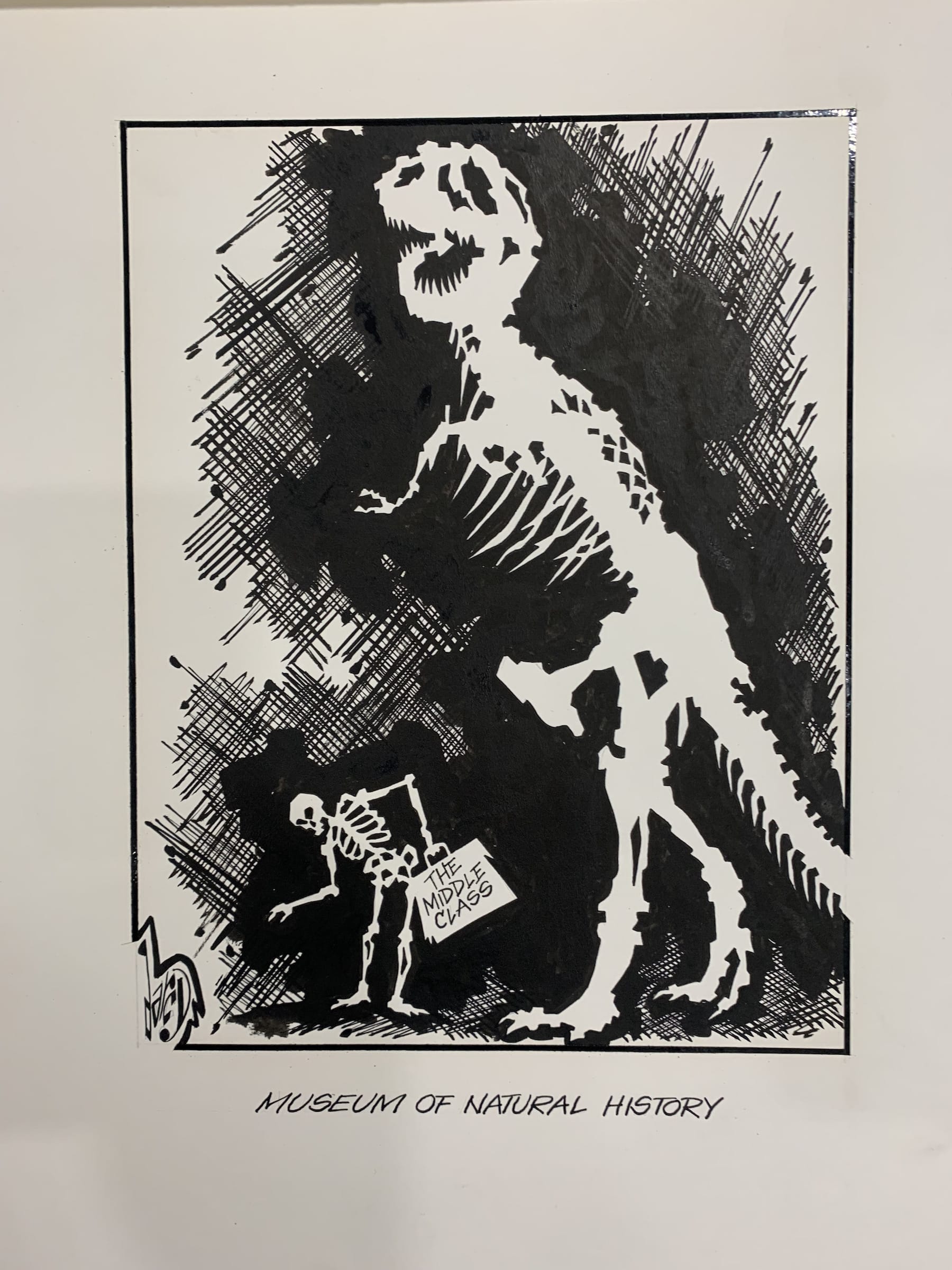Brad Darcy, whose practice is currently based out of a studio in the Financial District, told Hyperallergic that although his contemporary artwork may not resemble his father’s "politically charged cartoons," he was still heavily impacted by the experience of growing up with an artist-parent who was deeply passionate about social justice.