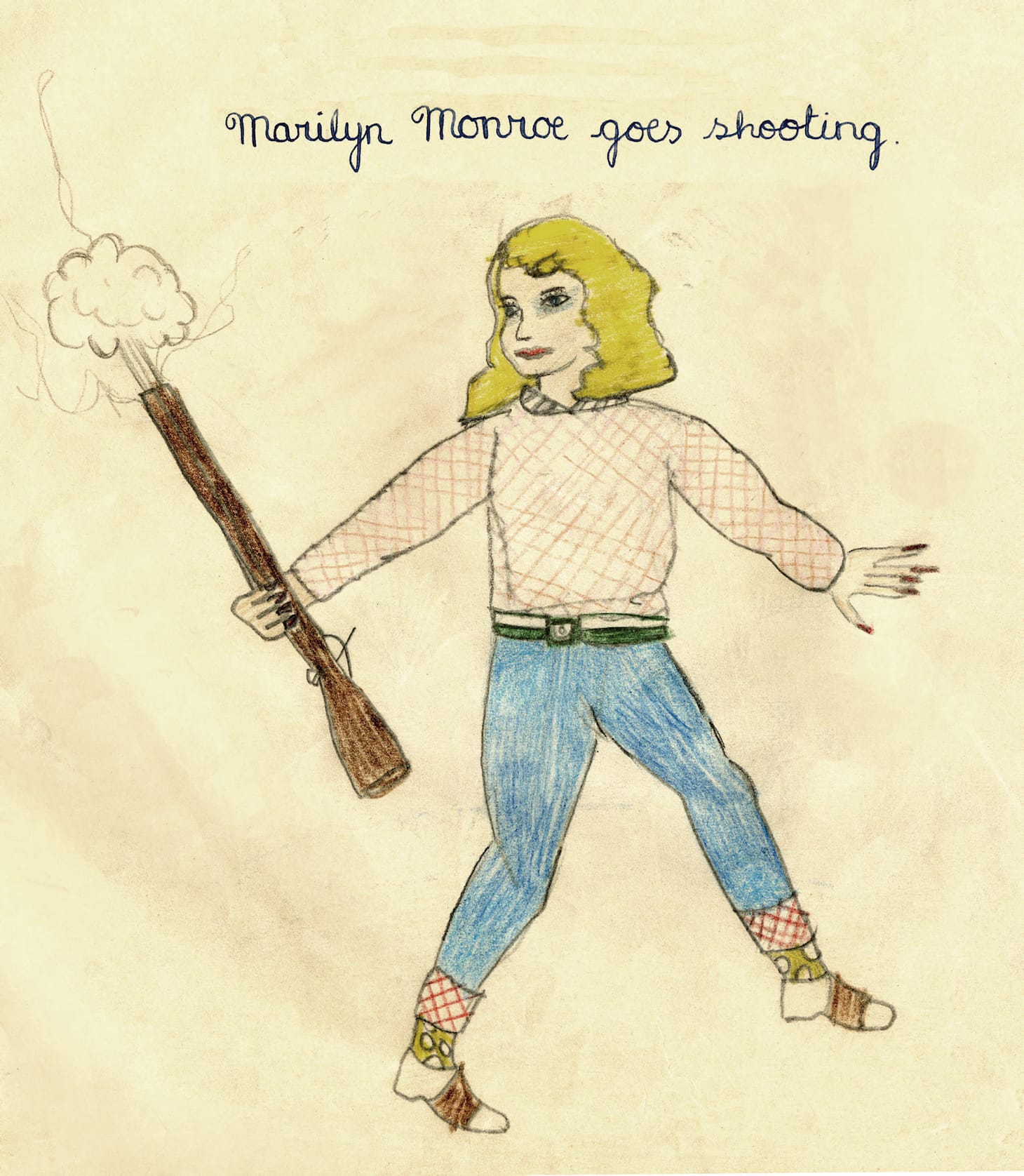 Simmonds was known for a particular and wry voice, evidenced even in childhood illustrations. In “Marilyn Monroe goes shooting,” drawn by Simmonds at age 9, a blonde, rather childlike Marilyn in blue jeans holds a rifle in one hand, its tip erupting in a puff of smoke. This tendency to reenvision the expected portrayal of a female character — Monroe is more cowgirl here than sex symbol — would be a defining feature of some of Simmonds’s most well-known later work.