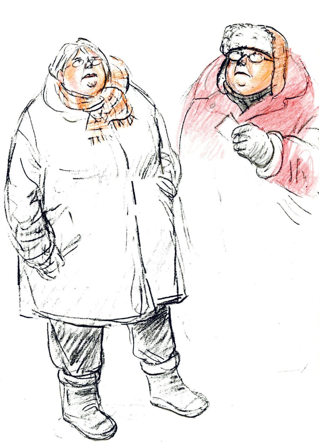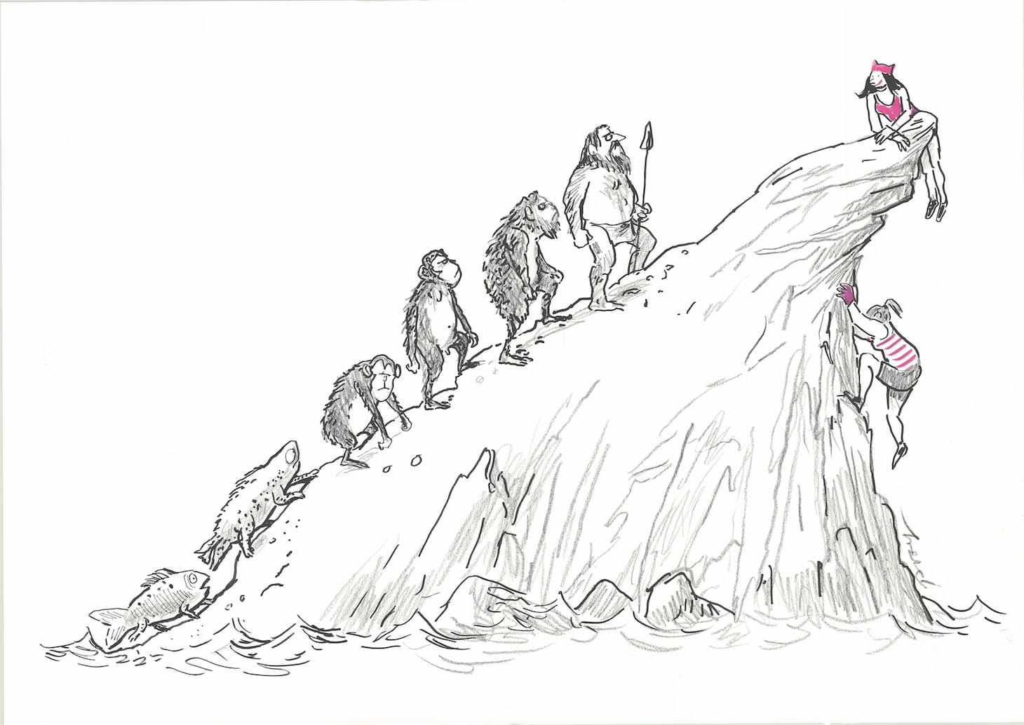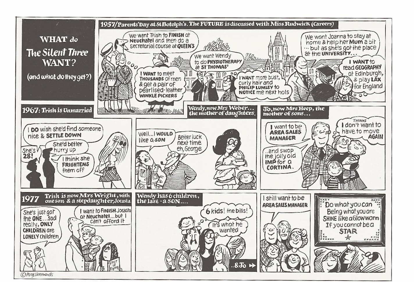 In a 2018 London conference about women’s suffrage, Simmonds drew a cartoon. One side shows the evolution of man, from fish to caveman, slowly climbing up a mountainside. But on the other, two human women have discovered how to climb the mountain, and one waits jauntily, in pink top and hat, at the tip-top, looking down at man’s tedious progression. This cheeky appreciation for female cleverness runs throughout Simmonds work. It certainly dominates her series “The Silent Three of St. Botolph’s: 20 years on,” which she drew for The Guardian’s Women’s Page in the late 1970s. Simmonds’s strip was a grown-up tribute to “The Silent Three,” a comic that ran in the magazine School Friend from 1950–1963. In the original version, a group of three British boarding school girls solve crime. In Simmonds’s version, the women are grown up, and the ambitions their parents had for them, or even their silly teenage dreams, have been transformed into middle-class doldrums. Wendy’s thoughts have evolved — in 1957: “I want to read Geography at Edinburg & play Lax for England”; in 1967: “I don’t want to have to move again” in response to her husband’s career ambitions; in 1977: her husband is thinking about his career and she ominously has no thoughts at all.
