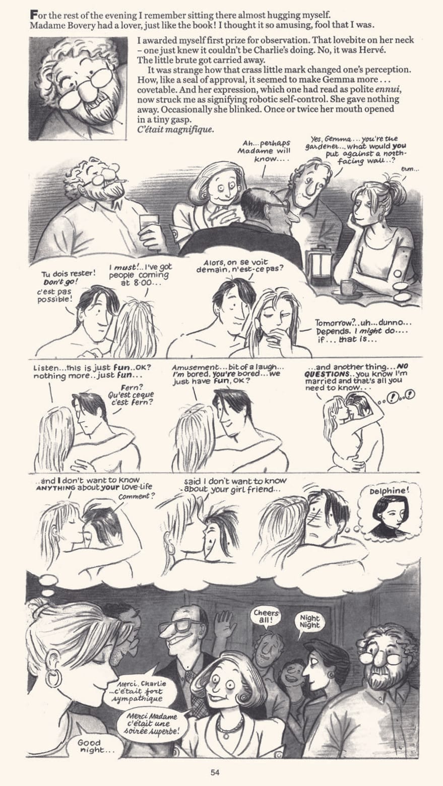 Often Simmonds’s feminist themes coincide with her general satirization of the ambitions of the British middle class, as in “Gemma Bovery,” her 1999 Guardian comic strip, (also published in the same year as a graphic novel). The strip’s full title: “The Late Gemma Bovery: A tale of adultery and soft furnishings narrated by Raymond Joubert,” hints at Simmonds’s humorous and very British reimagining of Flaubert’s tale of middle-class marital ennui.