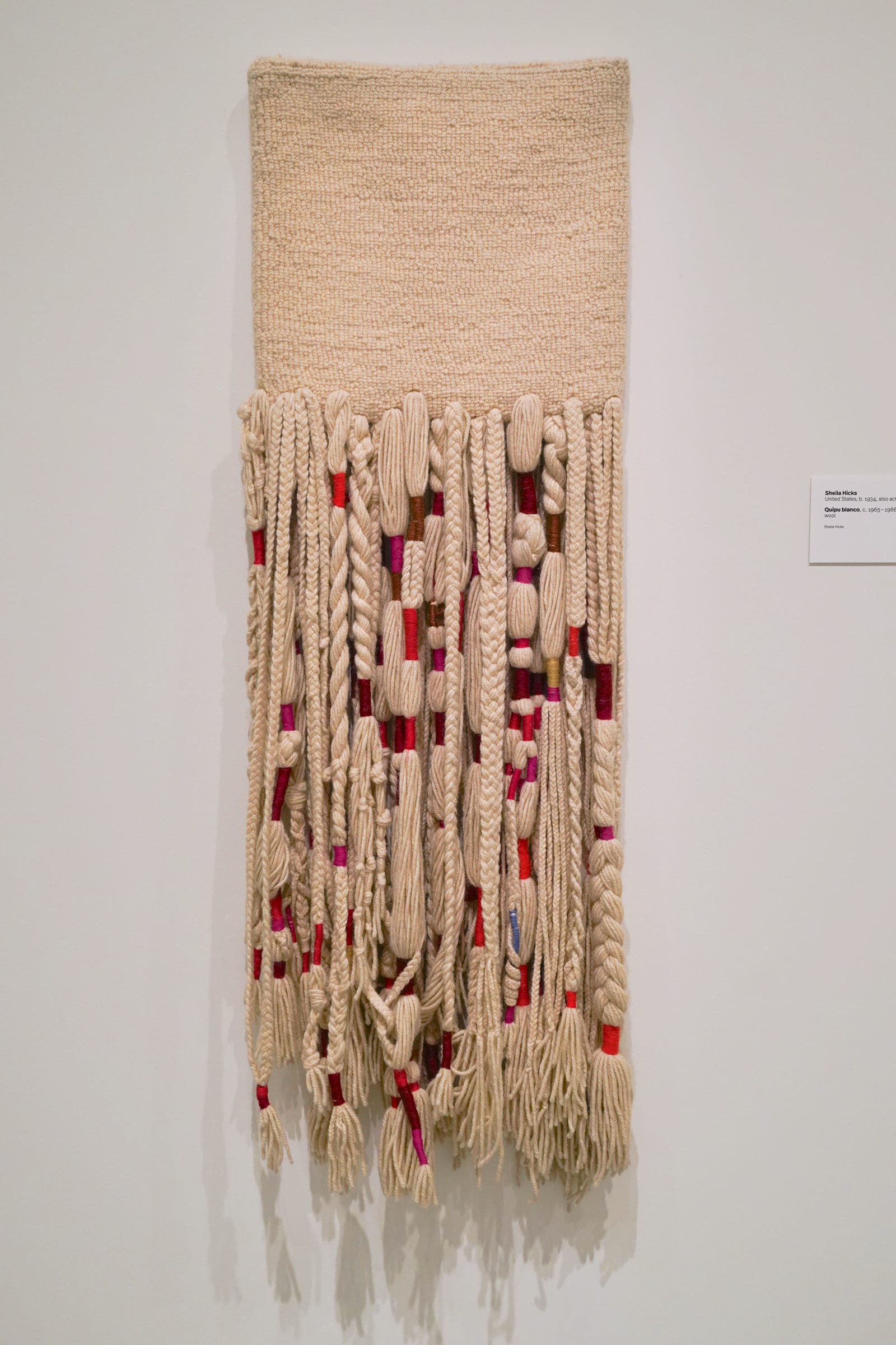 In a gallery devoted to knots, nets, and webs, the bones of textile making overlap with the visual language of abstract painting — nodding to both Albers’s writings on weaving’s grid structure and art historian Rosalind Krauss’s 1979 essay “Grids,” which argues that this structure is a hallmark of modernist abstract art. The dozen or so large, grid-like pieces that hang from these white walls underscore the connections between oil paintings, woven forms, and weaving technologies, like the Jacquard loom, a predecessor to computers. One label points out that canvas, a woven fabric, is “the literal foundation of modernist painting.” Put another way, paintings on canvas are a form of textile art.