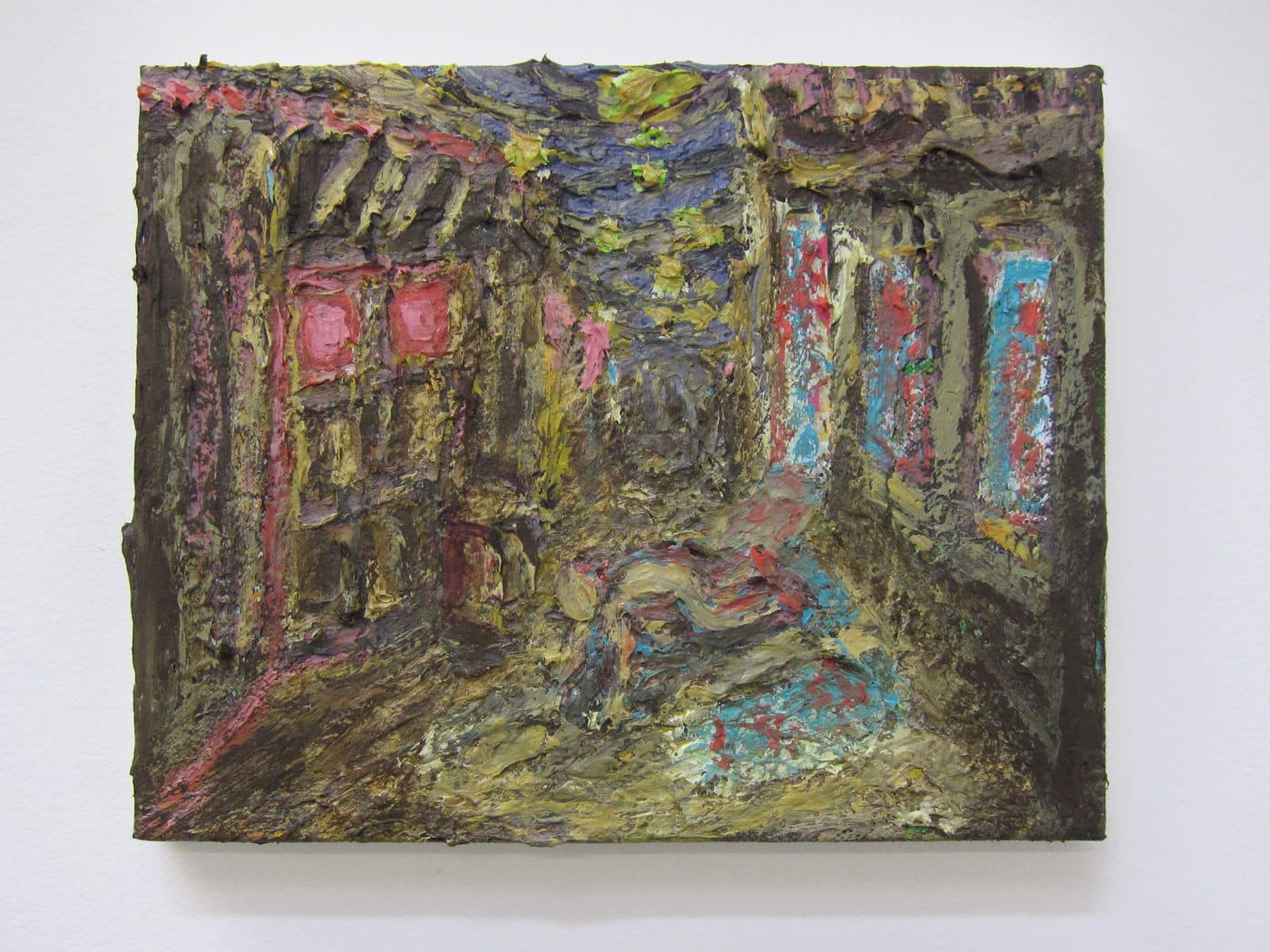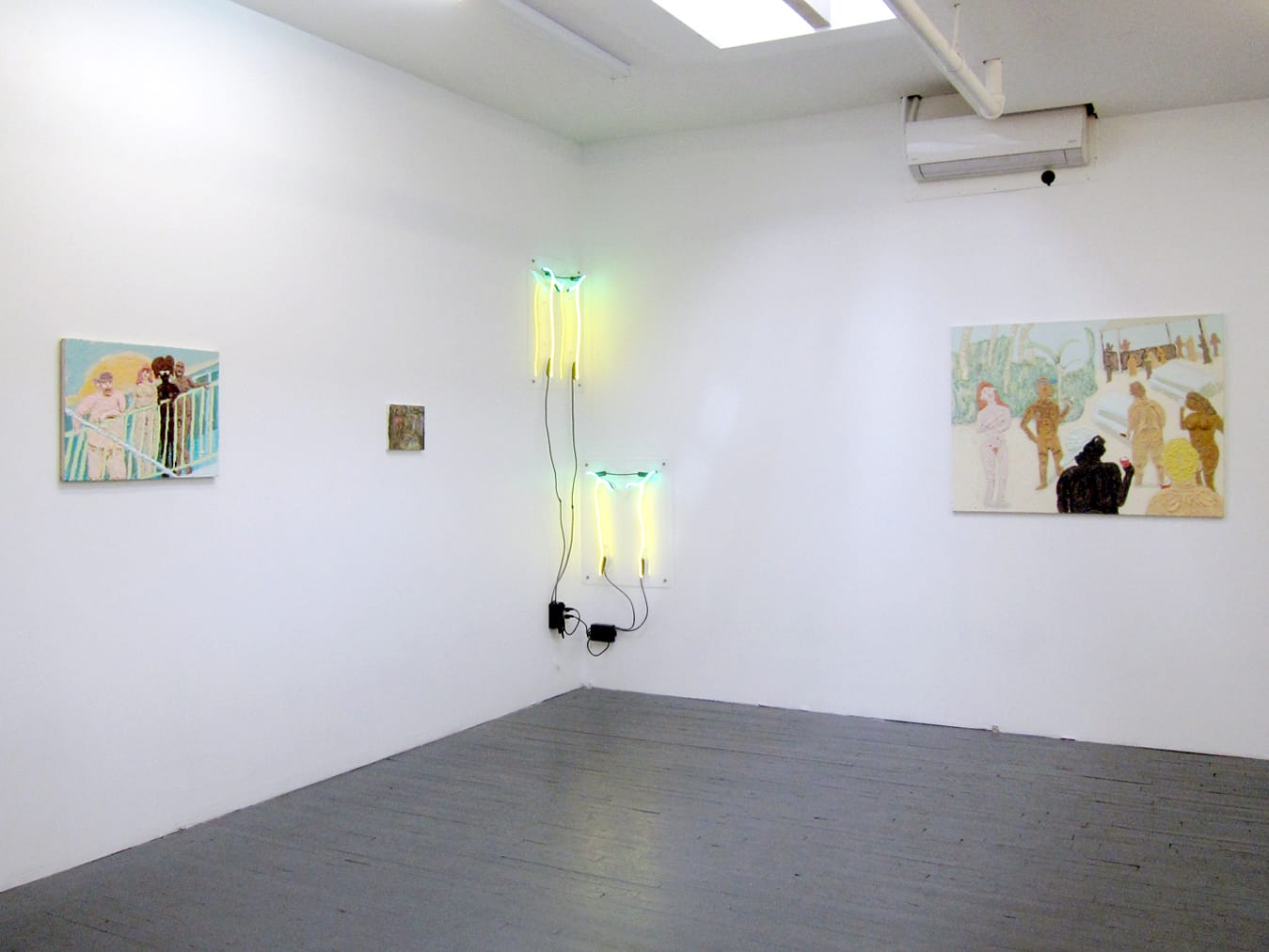 The locals, meanwhile, are deliberately excluded in Nguyen-Vo’s paintings. When they do appear, as in one painting centered on a blonde sunbather, they wander in the background as a small unit of faceless, cryptic beings — the “other” in their own land. In the real world, locals are often in similar positions, as dutiful members of staff who remain along the fringes of these resorts. Nguyen-Vo makes their invisibility and inferiority apparent in one tiny, dark scene that departs from the much larger, candy-colored beach views of tourists: centered on an alleyway of murky colors, a single resort worker stumbles out of a dive bar and falls; his abstracted figure disappears into thick daubs of neon lights and is nearly indistinguishable from those watery swirls. Next to the small painting hang two neon sculptures of wilted palm trees that illuminate the gallery, turning it into a dismal extension of this not-so-sunny scene.