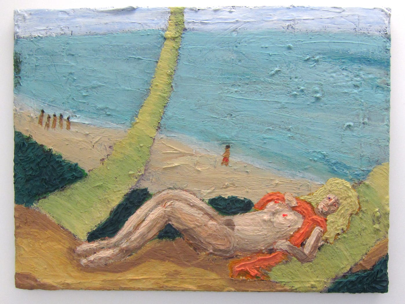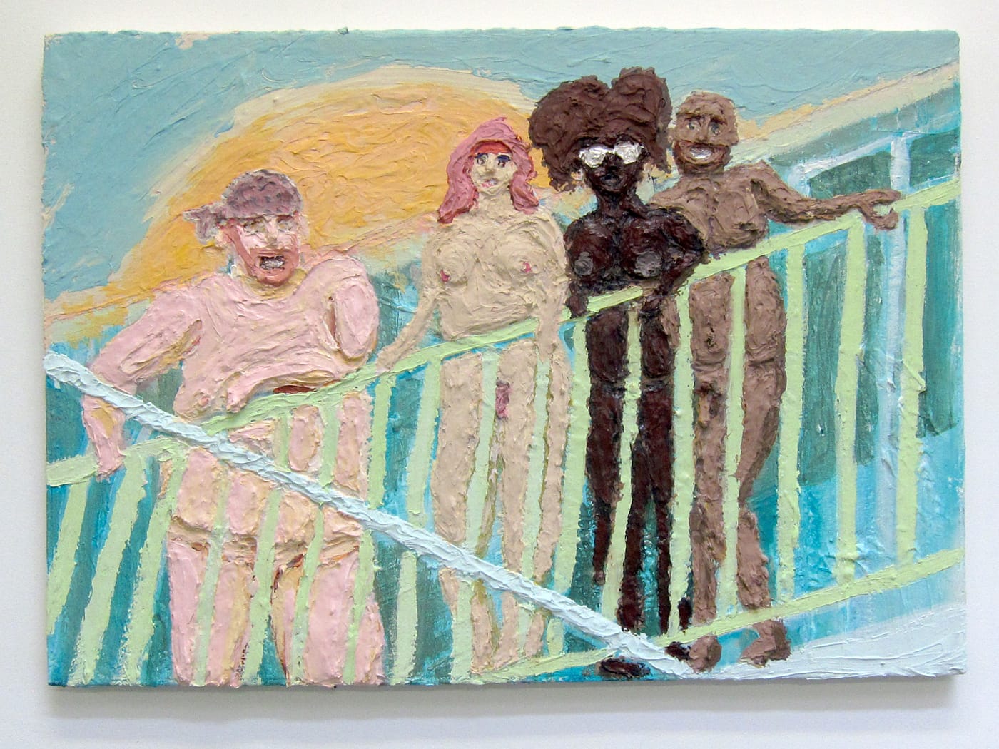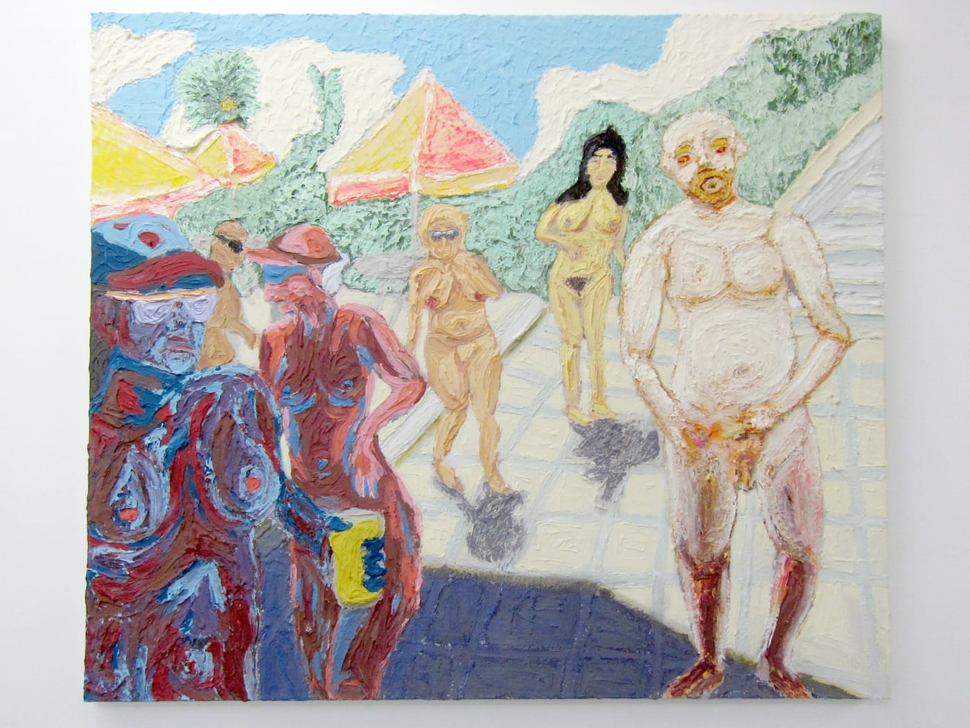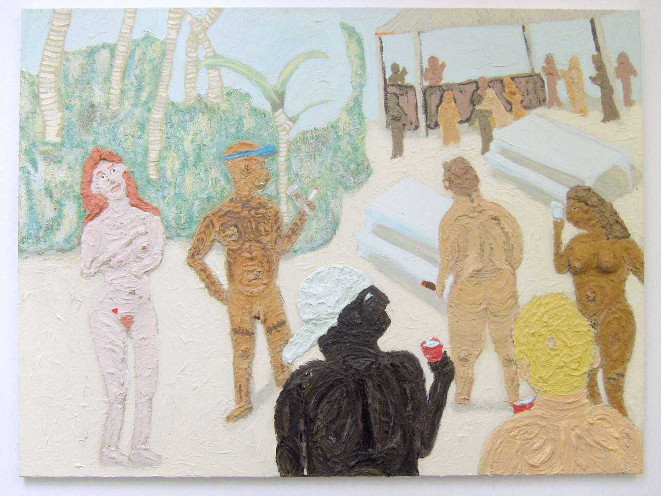 Colonial Beach represents the countless luxury resorts that dot not only the coasts of Vietnam, but of many other Southeast Asian countries that have experienced mass tourism in the last few decades, from Singapore to the Philippines. In these privatized and highly commercialized spaces, uninhibited leisure reigns, but only for the enjoyment of foreigners. In Nguyen-Vo’s paintings, pink-haired and pink-skinned figures smile, under a blazing sun, from the railing of what could be a cruise ship or a hotel balcony; pasty individuals, still clearly disoriented from late-night revelry, stumble around in the morning light; a group of passive beachgoers smoke and drink as they witness a fight in the distance. The artist turns tourists’ gazes back onto them to highlight their lawlessness; their nudity underscores their lack of inhibition but also alludes to colonial, Western constructs of far-off islands as wild, exotic destinations that offer escape from civilization.