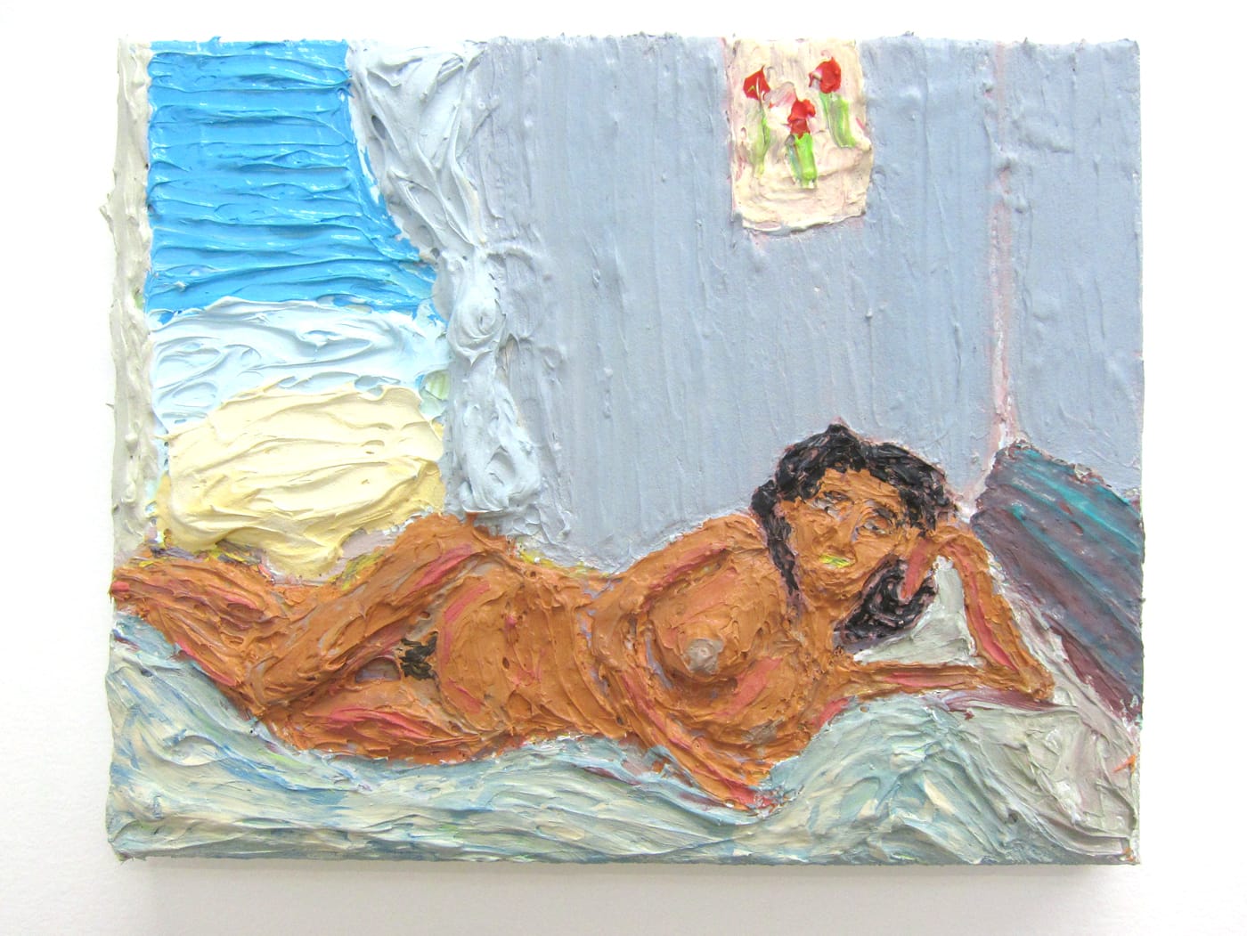 Nguyen-Vo’s use of thick, heavy paint, rendered in impressionist strokes like swirls of frosting, is intended as a pointed adoption of the techniques favored by artists of the country that colonized Indochina — techniques he noticed still influence Vietnamese art-making, mimicked by local craftsmen in paintings they sell as souvenirs. Two of his works call out the infamous travels of one French post-Impressionist, Paul Gauguin, who would be right at home on Nguyen-Vo’s colonial beach. Portraits of a blonde “Stacy” and a dark-skinned “Inés” posing as naked odalisques beneath palm trees and in a hotel room immediately recall Gauguin’s portraits of nude French Polynesian girls, with whom the artist forged questionable relationships as he sought a new, idyllic life far away from France. These fictional characters embody the mythology and romance that foreigners naively assign to distant landscapes and their inhabitants.