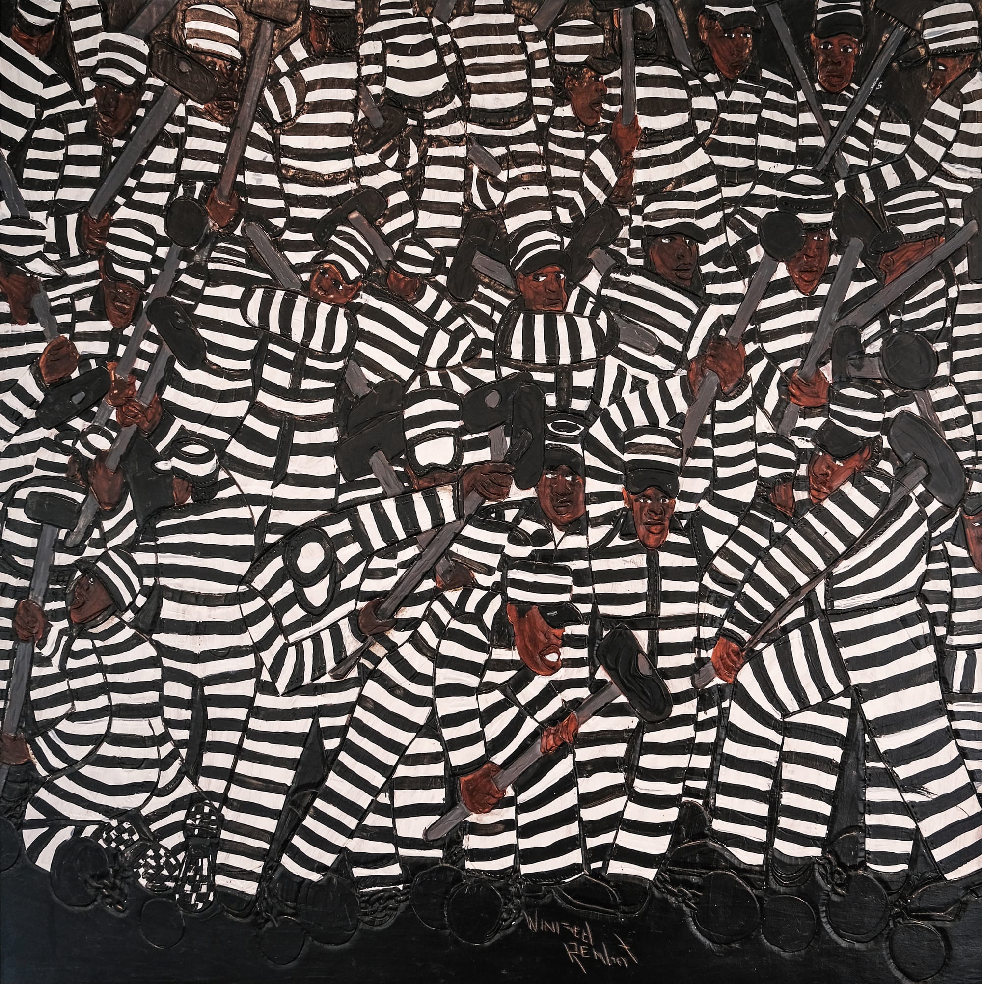 James Barron and the gallery's director Dylan Everett walked me through the show and narrated Rembert's life story. After stealing a car to escape two gunmen at a civil rights protest in 1965, he spent seven years in prison. He was forced into manual labor while incarcerated, which he depicted in the multiple self-portrait "Looking for Rembert" (2012), so packed with chaotic movement that the stripes on the artist’s prison garb morph into a pattern. Another narrative work, "Hamilton Ave" (2006), portrays the car chase that led to Rembert's prison sentence.