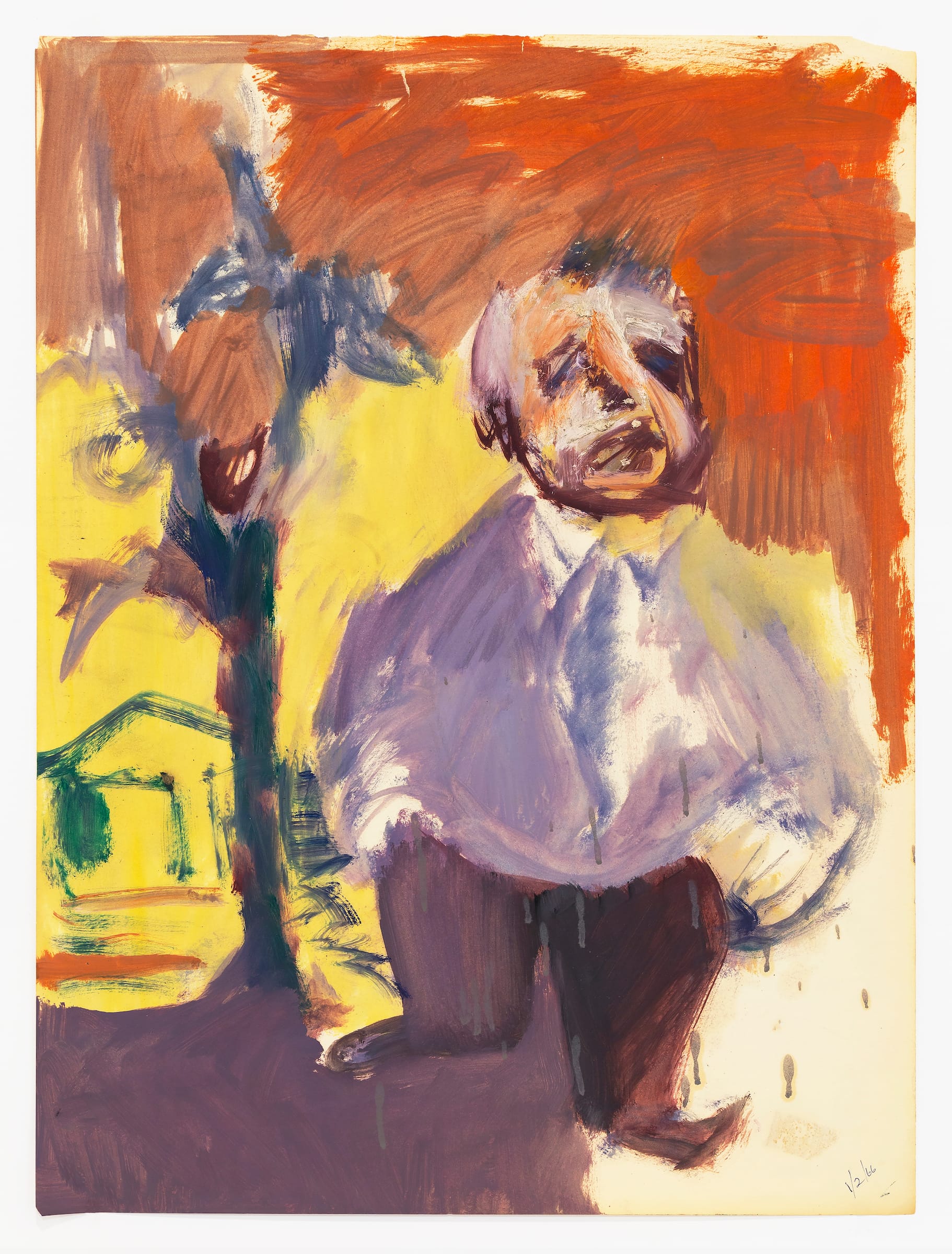 Bergman showed me Vivian Browne's 1966–1969 Little Men paintings, which are nearly identical in theme. The series comprises bright, expressionistic renderings of infantilized White men in suits. In “Little Men #84” (1966), a roughly outlined baby lurches confidently toward the viewer dressed in a jacket and tie. His gaping mouth appears mid-yell and his hands seem to be clenched, although it is difficult to discern any shapes beyond the torso of the man-child focal point. The pastel coloring contradicts the painting's sinister subject matter, although the palette is fitting for an infant.