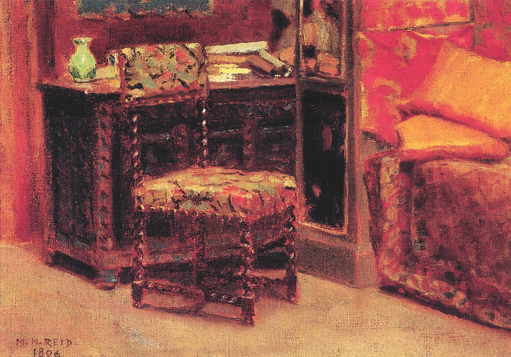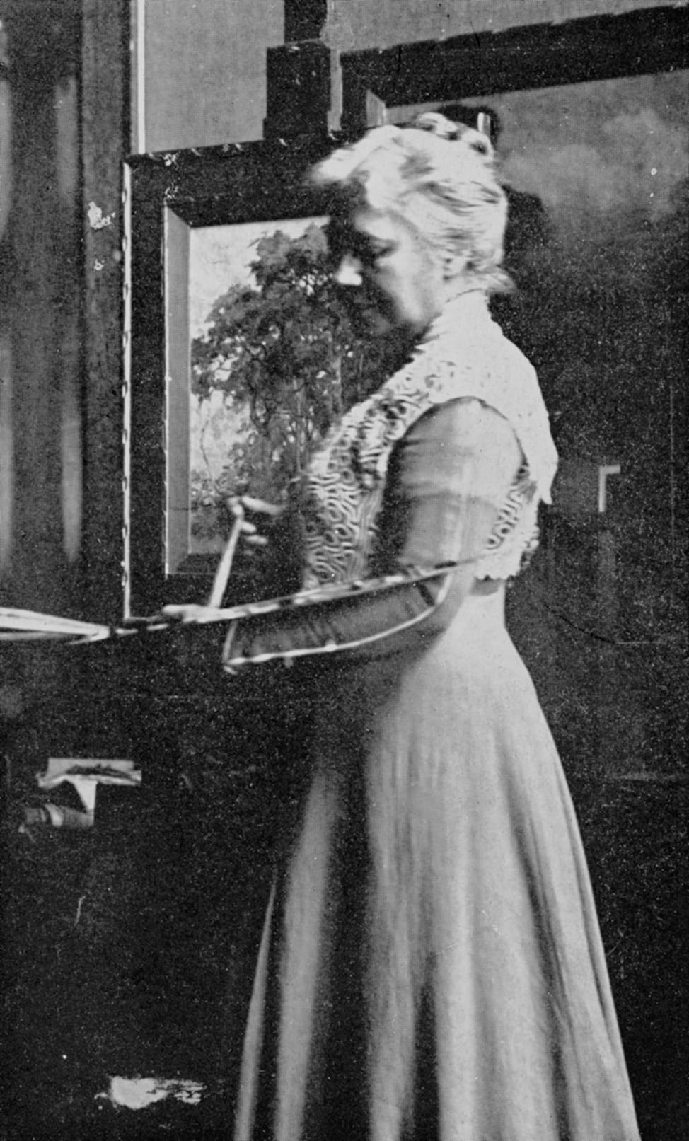 In George Agnew Reid’s 1889 painting “Dreaming,” the model is his wife, but she’s also an artist. We don’t see the face of the now nearly forgotten painter Mary Hiester Reid as she leans toward a fireplace in their shared Paris studio, but the glowing embers illuminate her long apron and clasped hands. Perhaps the fire represented the lady painter’s atypical artistic aspirations in a world still firmly dominated by men. But in practical terms, the fireplace also represented a challenge to the sitter-wife-painter, who had to cook all of her husband’s meals with it. “Haven’t done a stroke of painting,” Hiester Reid later wrote to a friend in 1909, “cooking & cleaning take all my time.”