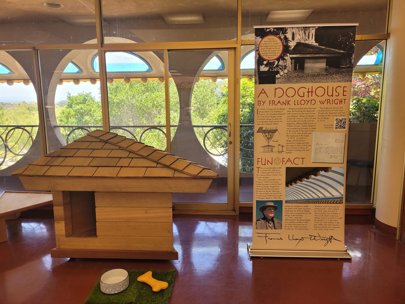 In keeping with Wrightian principles of incorporation, the curved plexiglass used to protect the doghouse display is repurposed from one of the original Marin County Civic Center skylights (although the skylights were added after the architect’s death, to shelter the open mall areas that were part of the original Civic Center design).