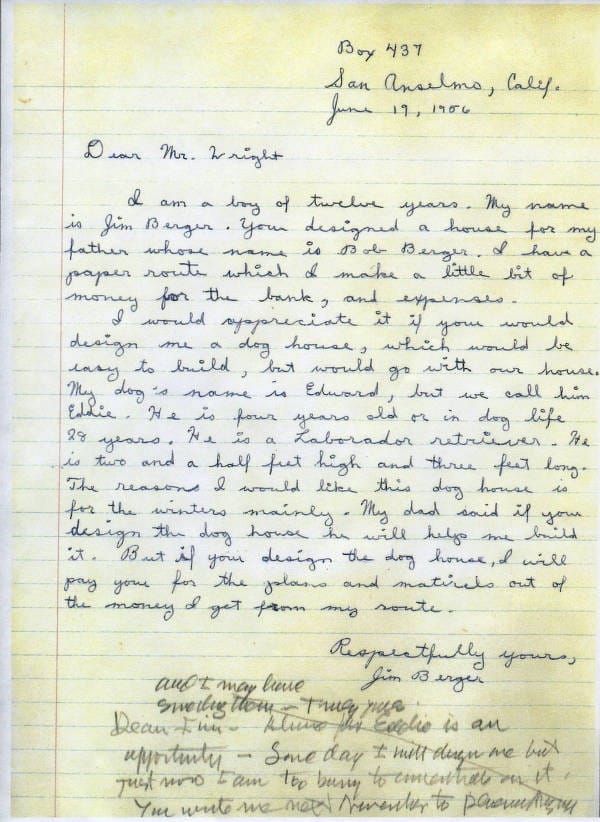 “My dog’s name is Edward, but we call him Eddie. He is four years old or in dog life 28 years,” reads the letter penned by the young Berger, in which the boy adds he would pay for the doghouse with money from his newspaper route.
