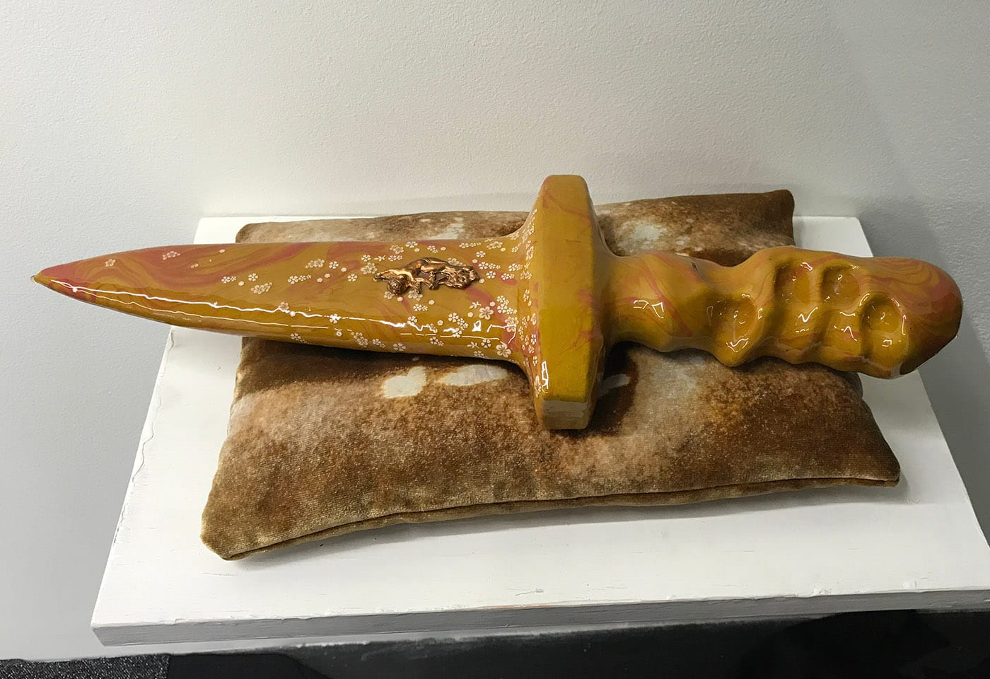 There is only room enough for two or three people to peruse Gas’s interior at any one time, but this rather intimate experience creates space for private reflection. On one wall sits Lauren Satlowski’s “For Protection,” a sculpted dagger, marked by the impressions of a hand’s strong grip, with a golden cherubic figure dancing just above the handle, and white painted flowers scattered about its surface of gold and pink marbled paint. Satlowski’s dagger is decidedly a feminine object, a weapon, and a symbol of women’s defense against masculine aggression.
